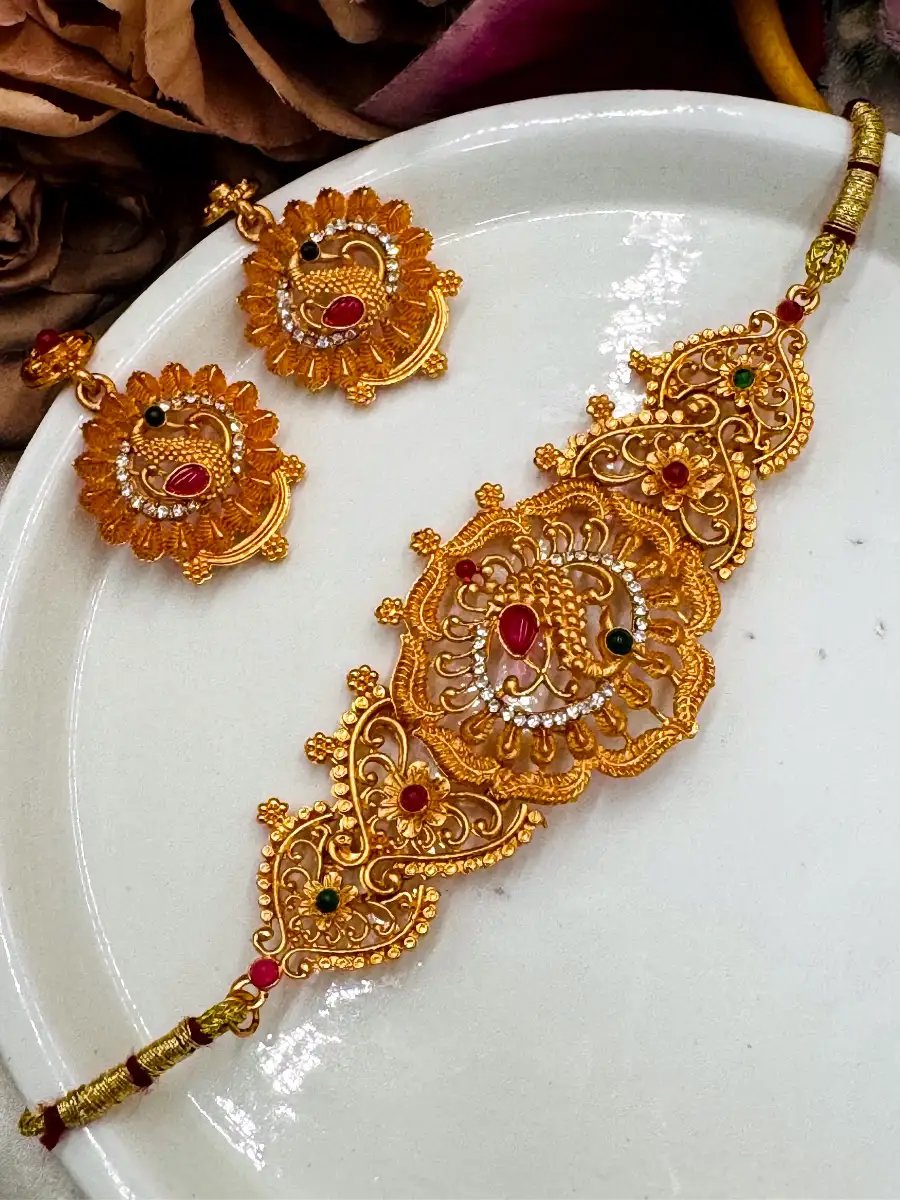 Turn heads with this stunning gold-hued zircon necklace set featuring a brilliant cut pendant, matching earrings, and a maang tikka. Ideal for weddings, parties, or festive occasions.