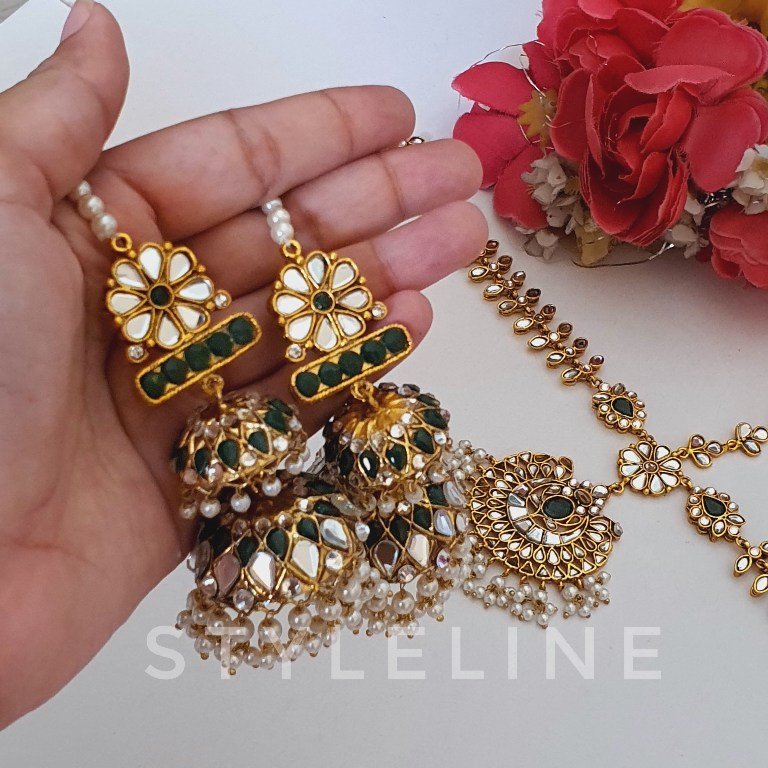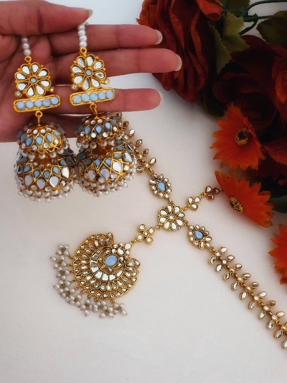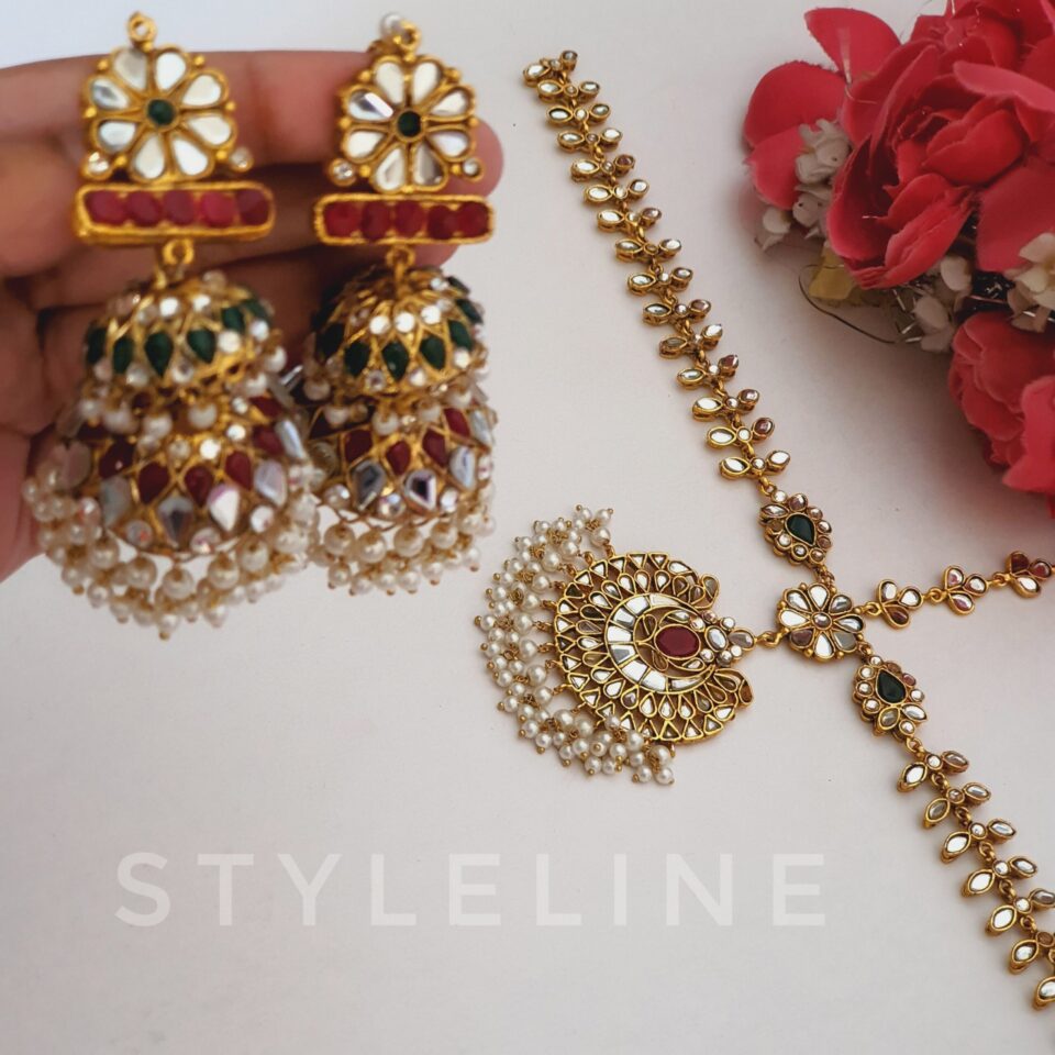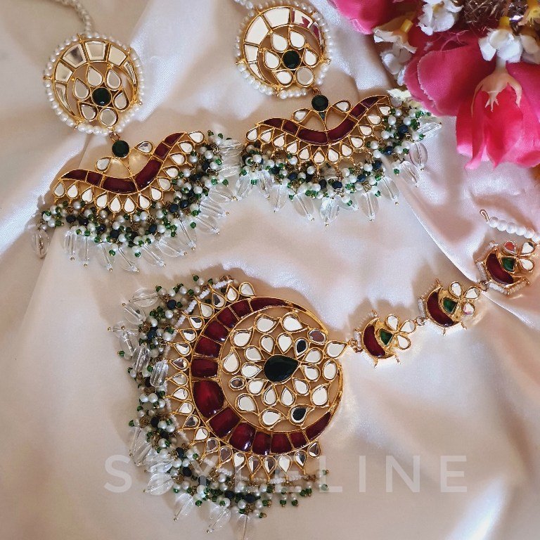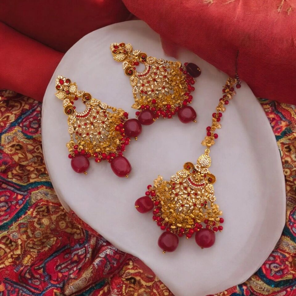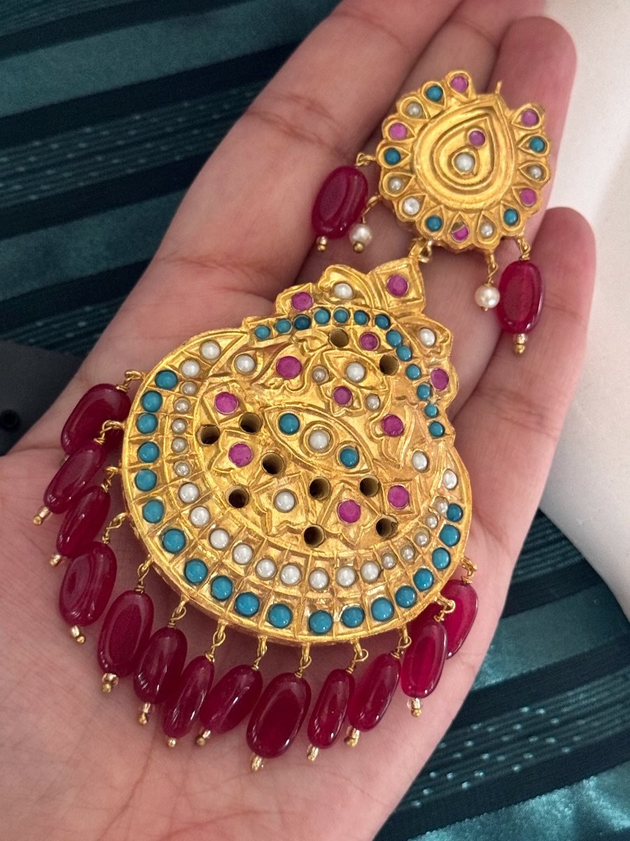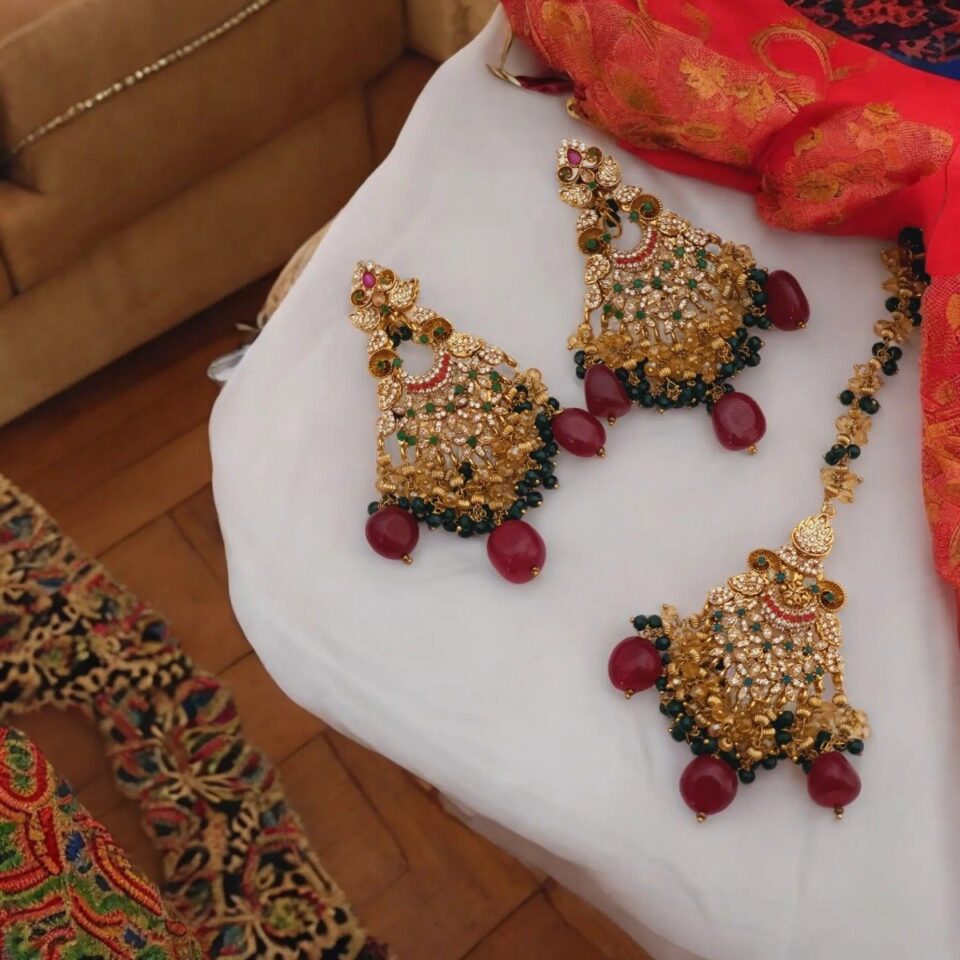 Add a touch of royalty to your look with our **22K Gold Plated Thappa Kundan Earrings and Bindi Set**. Featuring intricate thappa kundan work, vibrant maroon, turquoise, and ruby accents, this set is perfect for weddings or festive events, blending traditional elegance with modern charm.