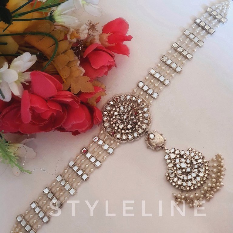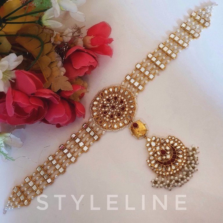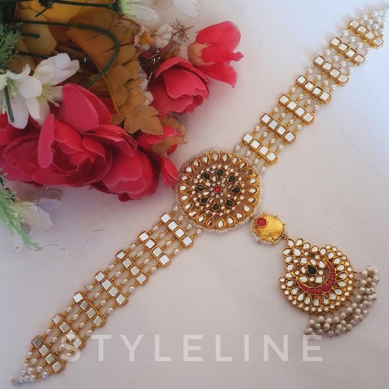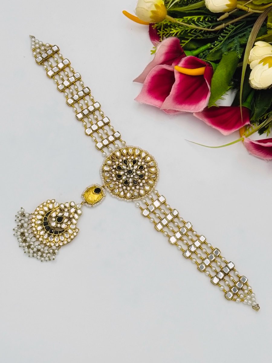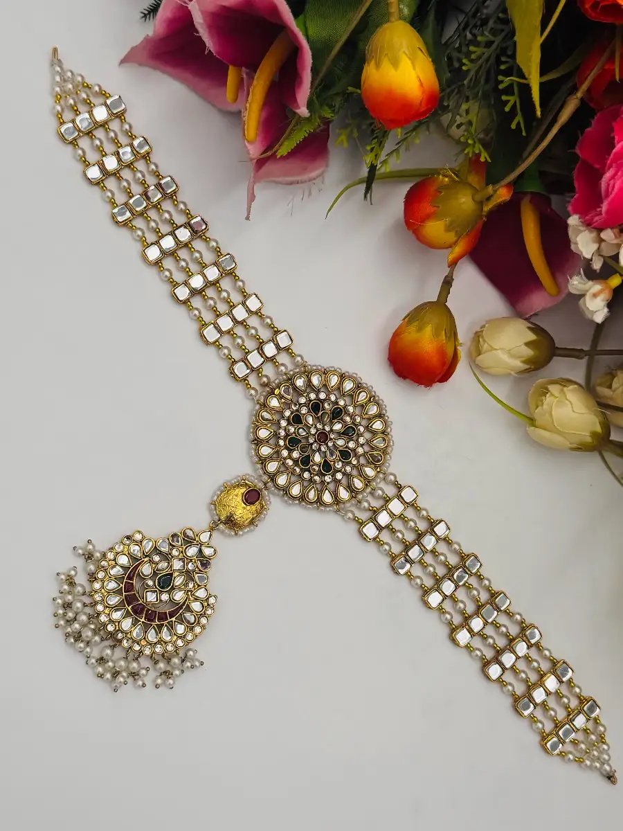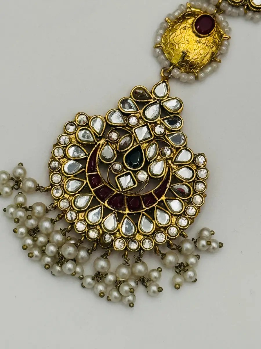 Featuring Aliya kundun headpati emblished with kundun, crystals and pearls.