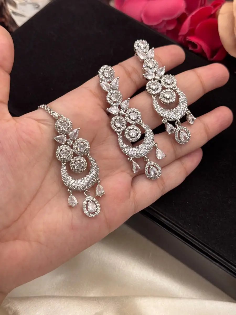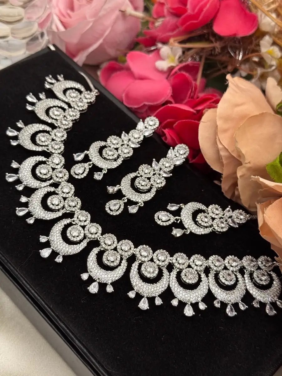 StyleLine’s Regalia Zircon Set – a luxury necklace set with earrings and bindi, featuring dazzling zircons. Perfect for weddings, parties, and festive occasions.