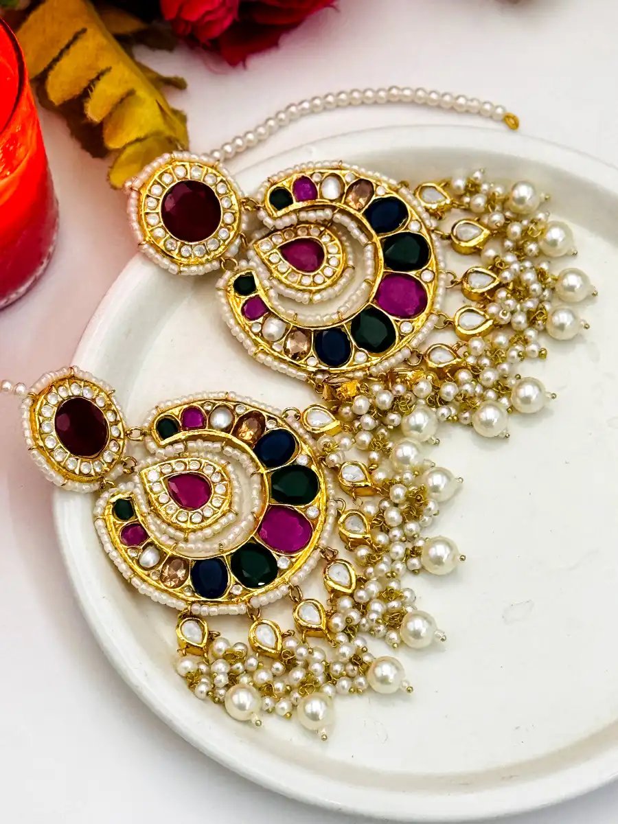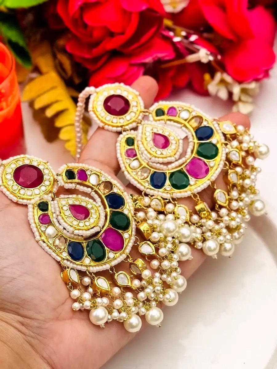 bridal kundan earrings, multi stone earrings pakistan, wedding jewelry pakistan, handmade kundan earrings, pearl kundan earrings, ethnic jewelry pakistan