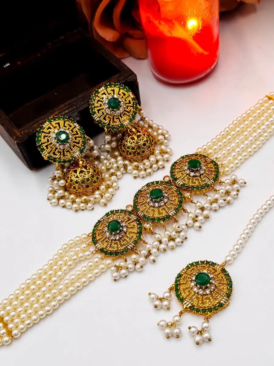 Products tagged “Handmade choker set?n Party wear choker design, Tikka jhumka choker set, Premium quality jewelry Pakistan, Mughal style choker set”