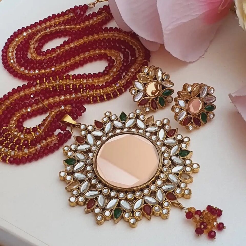 multi layer mala set, ruby red mala jewelry, gold plated kundan earrings, traditional Pakistani jewelry, wedding mala set, handmade kundan necklace kundan bridal set
