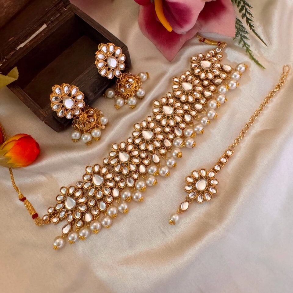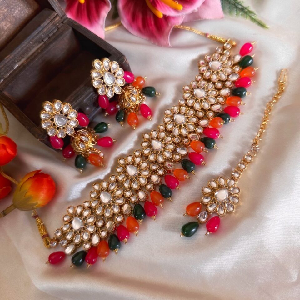 Discover the elegance of our handcrafted traditional Mehr choker set, where timeless artistry meets modern sophistication. Each piece is meticulously designed using high quality materials perfect for making unforgettable impressions at any celebration. Celebrate your unique style with vibrant colors and exquisite details that embody cultural heritage, all while ensuring comfort and grace.