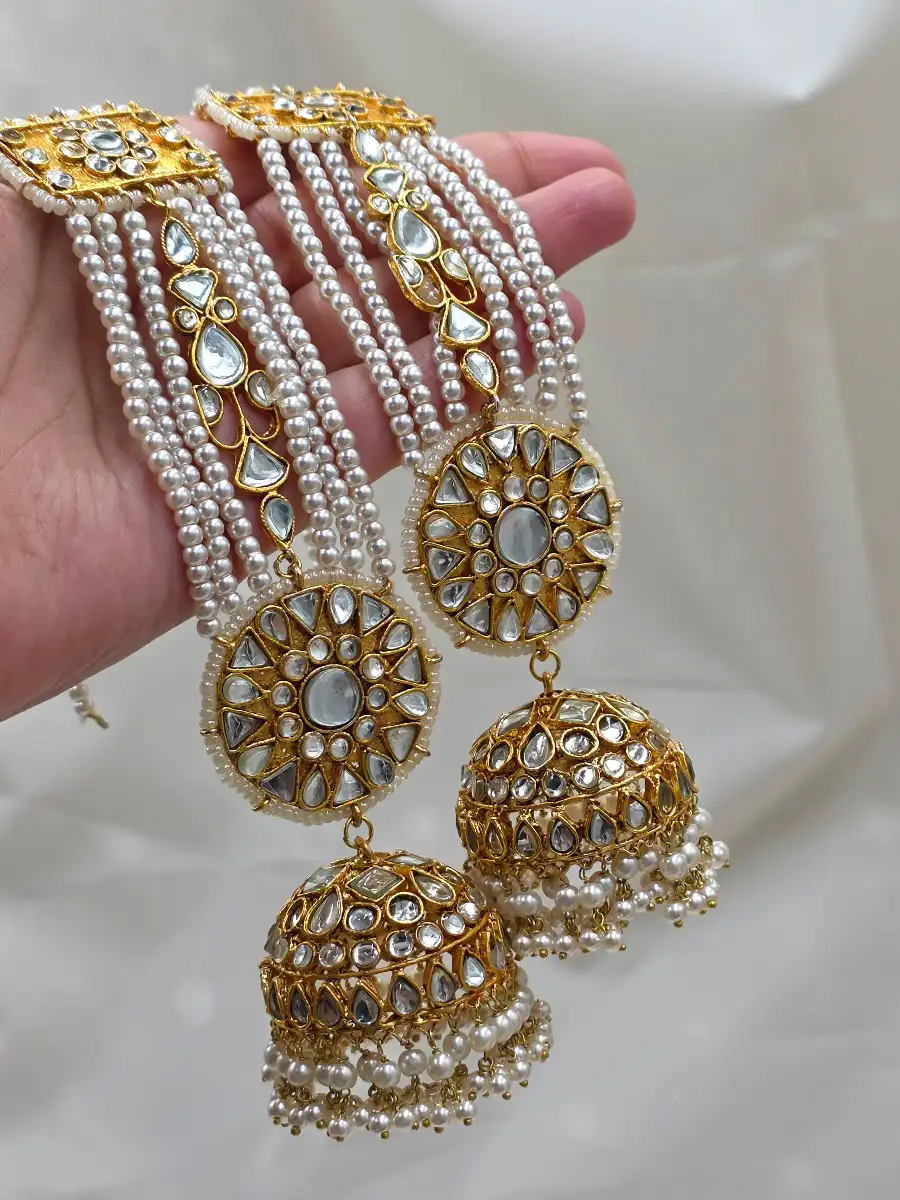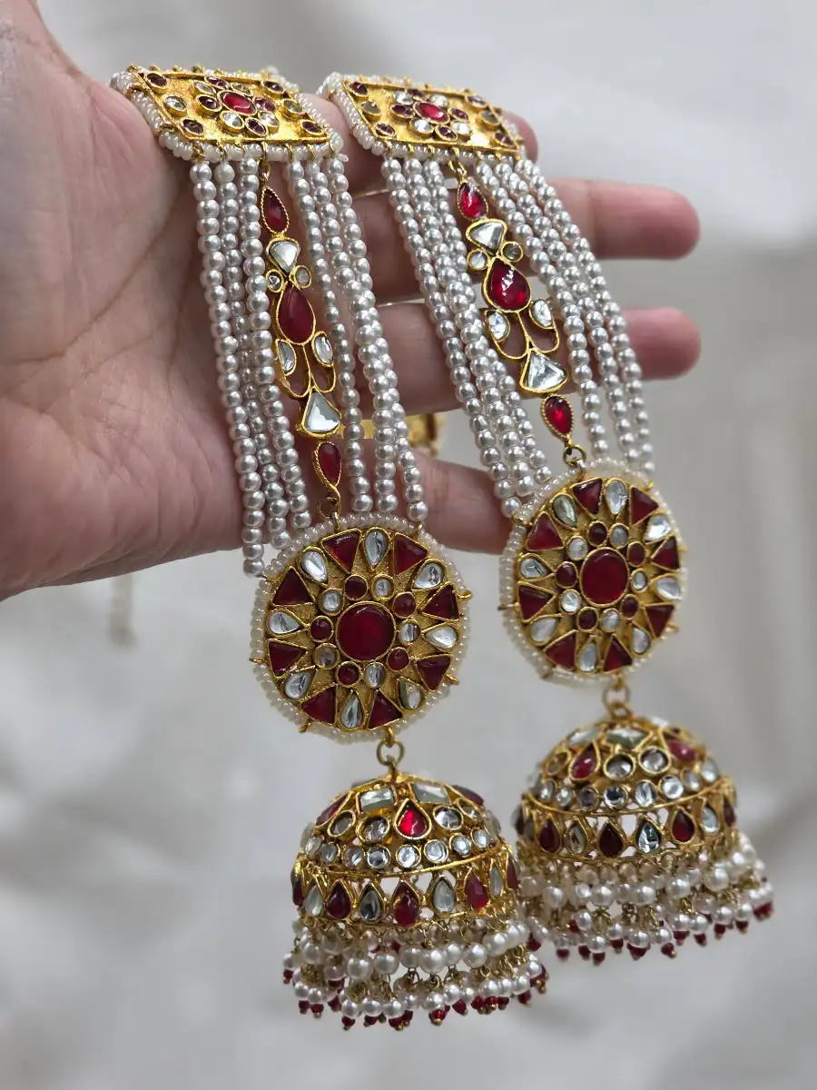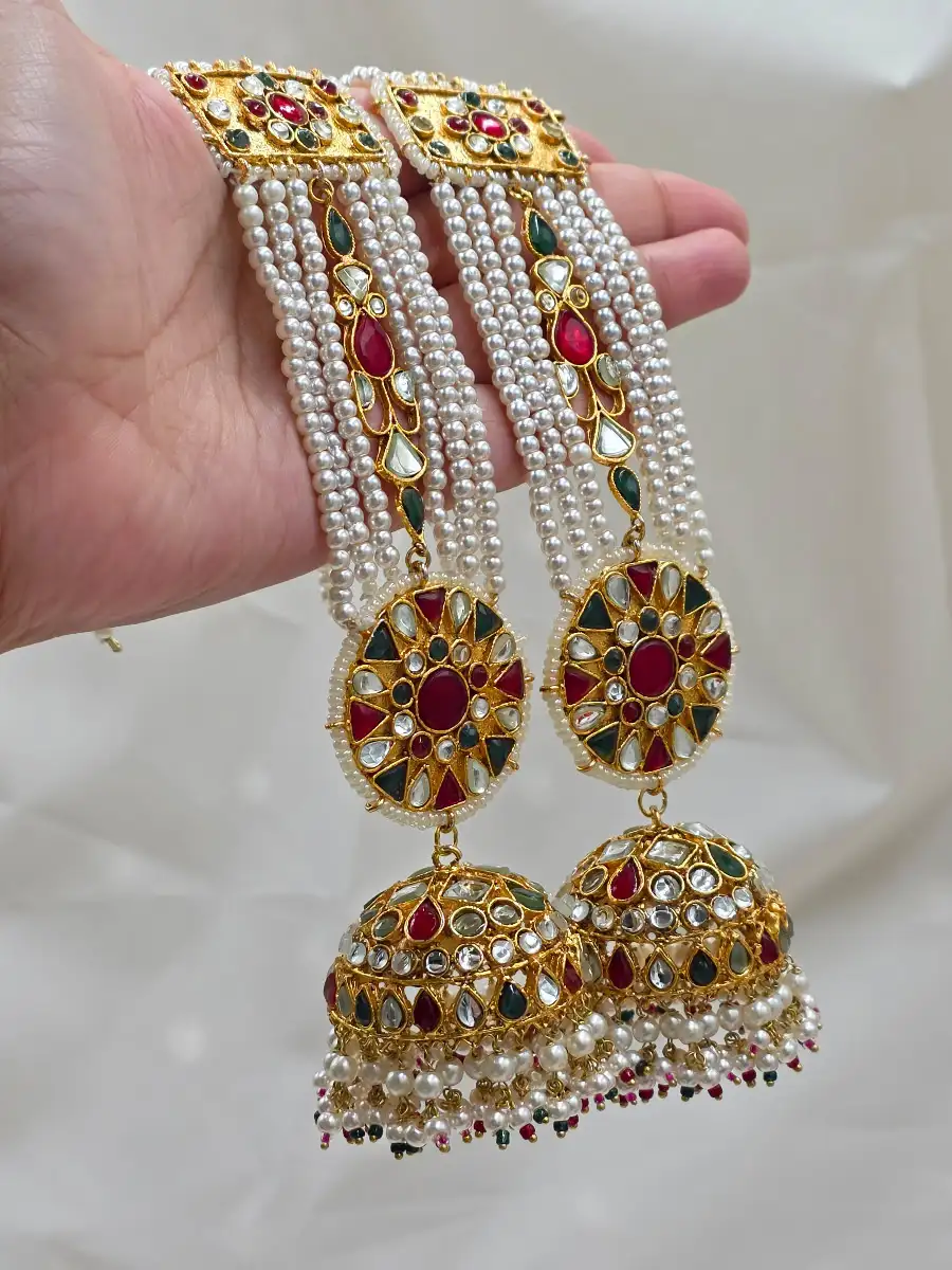 Products tagged “Pakistani jhumka, Jhumka with sahara, Long sahara earrings, Bridal jhumka Pakistan, Kundan jhumka, Pearl sahara earrings”
