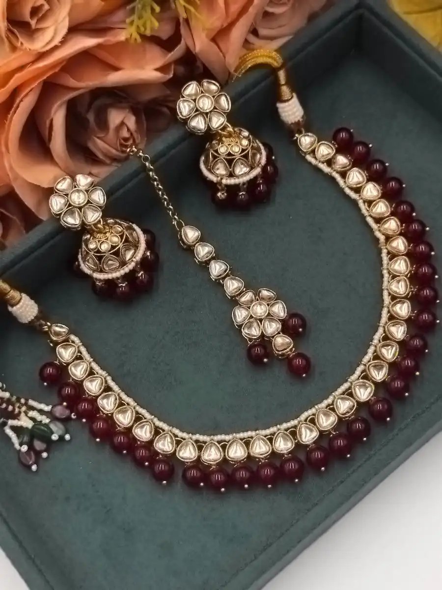 StyleLine’s premium polki kundan choker/necklace adornedwith maroon beads and paired matching earrings + tikka—perfect for bridal and festive wear.