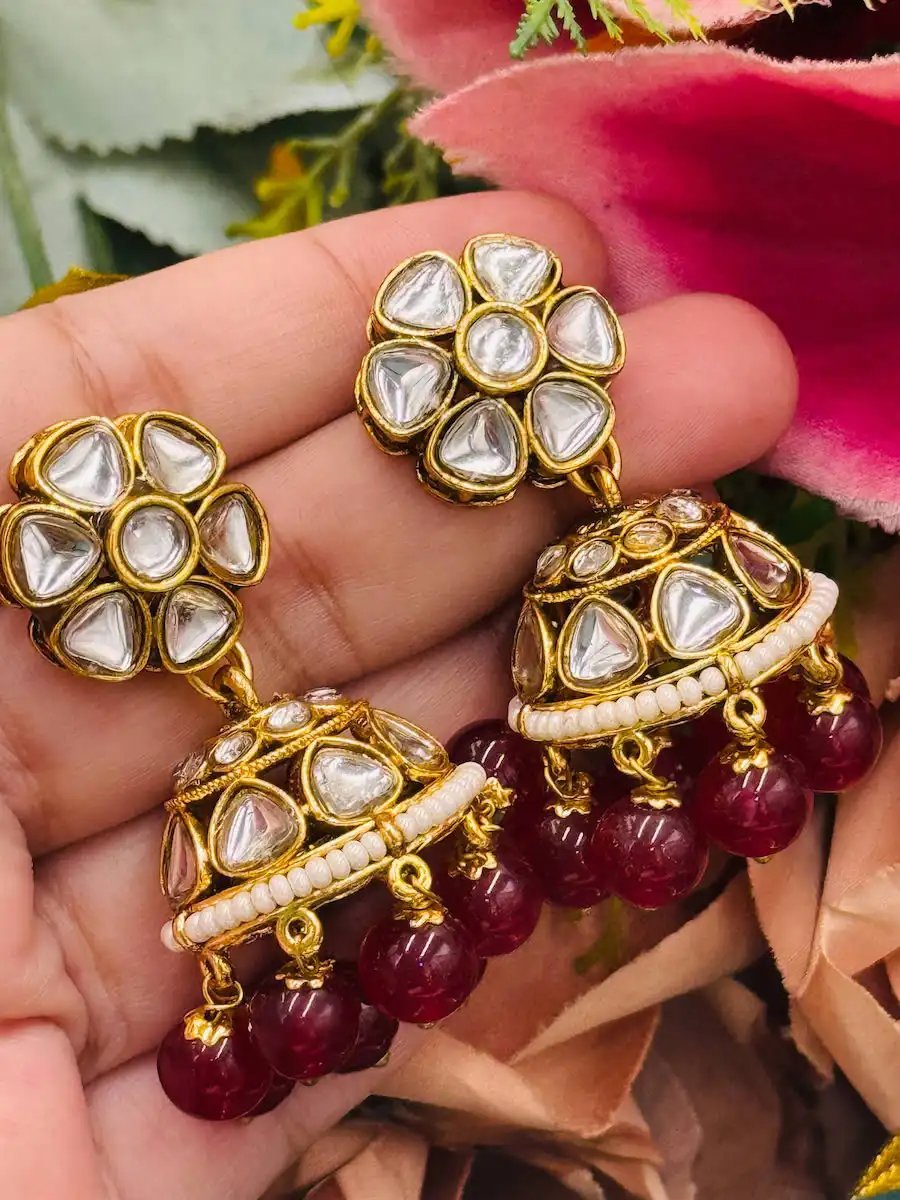 Premium quality Original Polki Necklace featuring gold-toned detailing, lustrous Polki stones, maroon beads, and pearl accents. Perfect for bridal and formal wear. Elegant, durable, and beautifully handcrafted for a royal look.