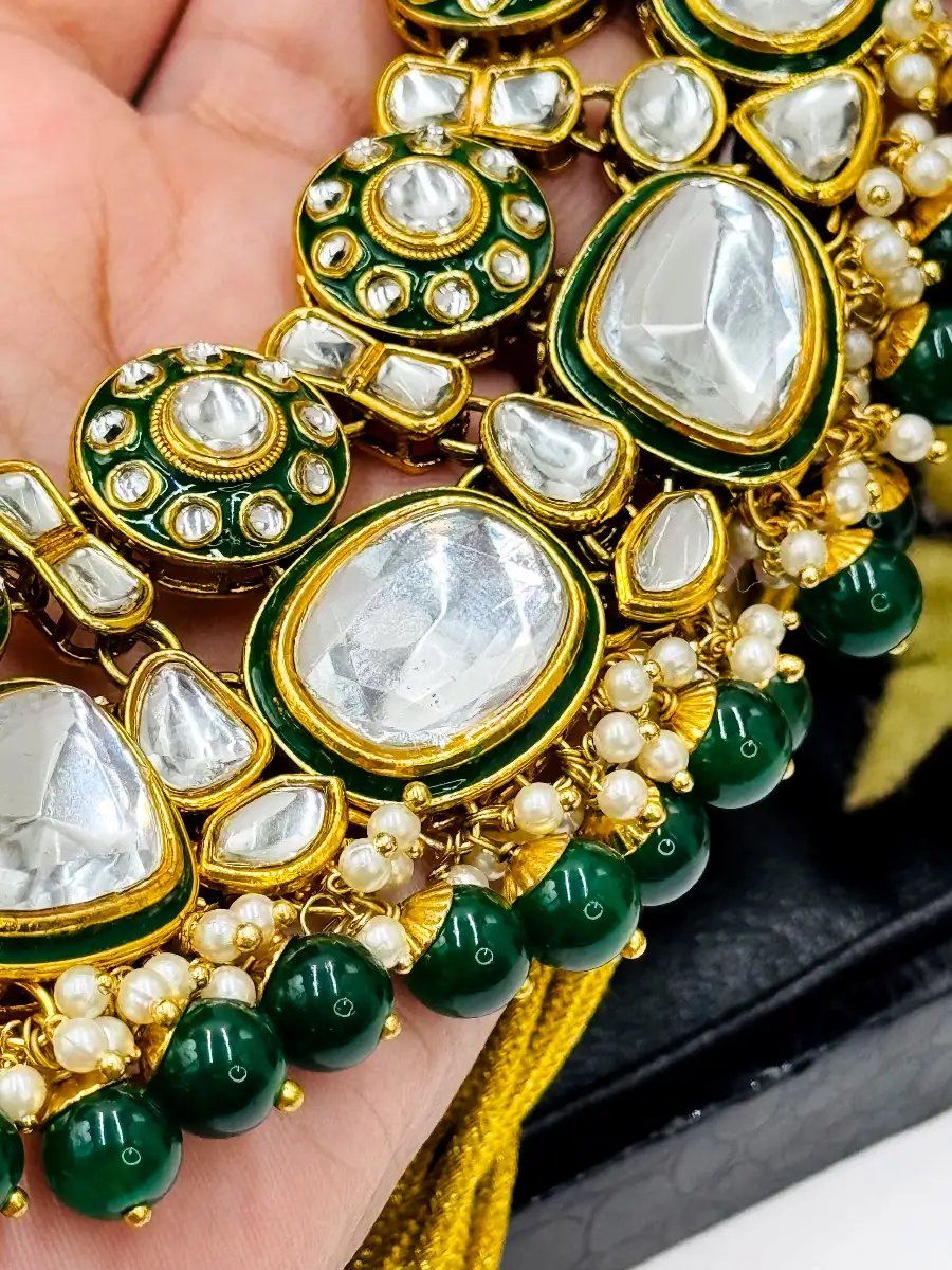 StyleLine’s premium original polki kundan bridal necklace set with matching earrings, tikka, and handpiece—ideal for mehndi, mayun, baraat, and walima looks.