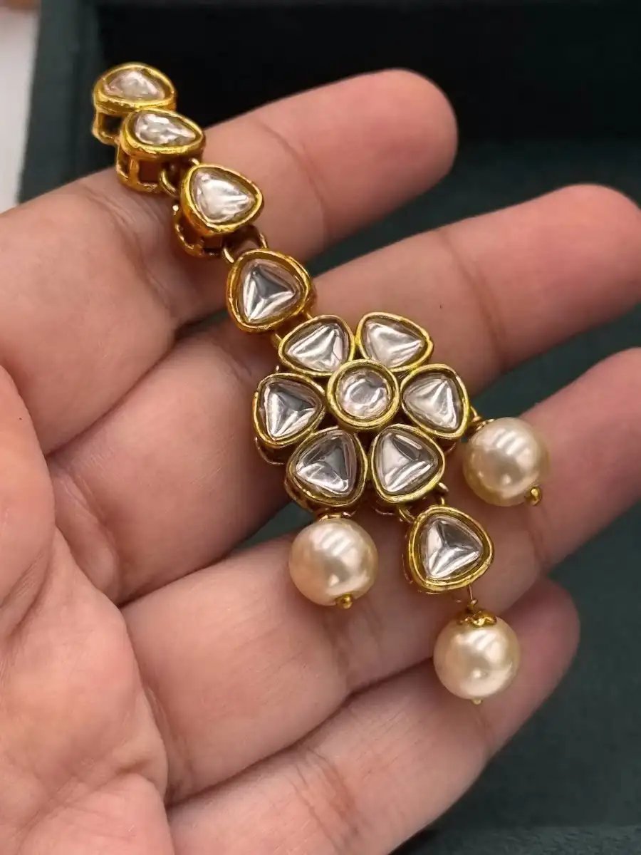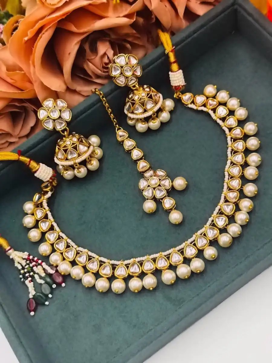 StyleLine’s premium polki kundan choker / necklace adonred with lustrous pearls and paired matching earrings + tikka—perfect for bridal and festive wear.