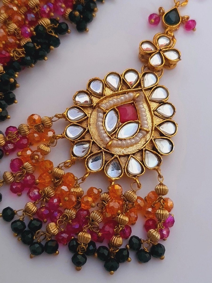 Introducing an exquisite choker set that radiates traditional elegance and vibrant charm. This set features a beautifully crafted choker with intricate Kundan-style stones, framed in a golden finish, and adorned with delicate pearl and colorful beadwork in shades of green, pink and orange. The symmetrical design is highlighted by teardrop and floral motifs, giving it a rich, regal appeal.