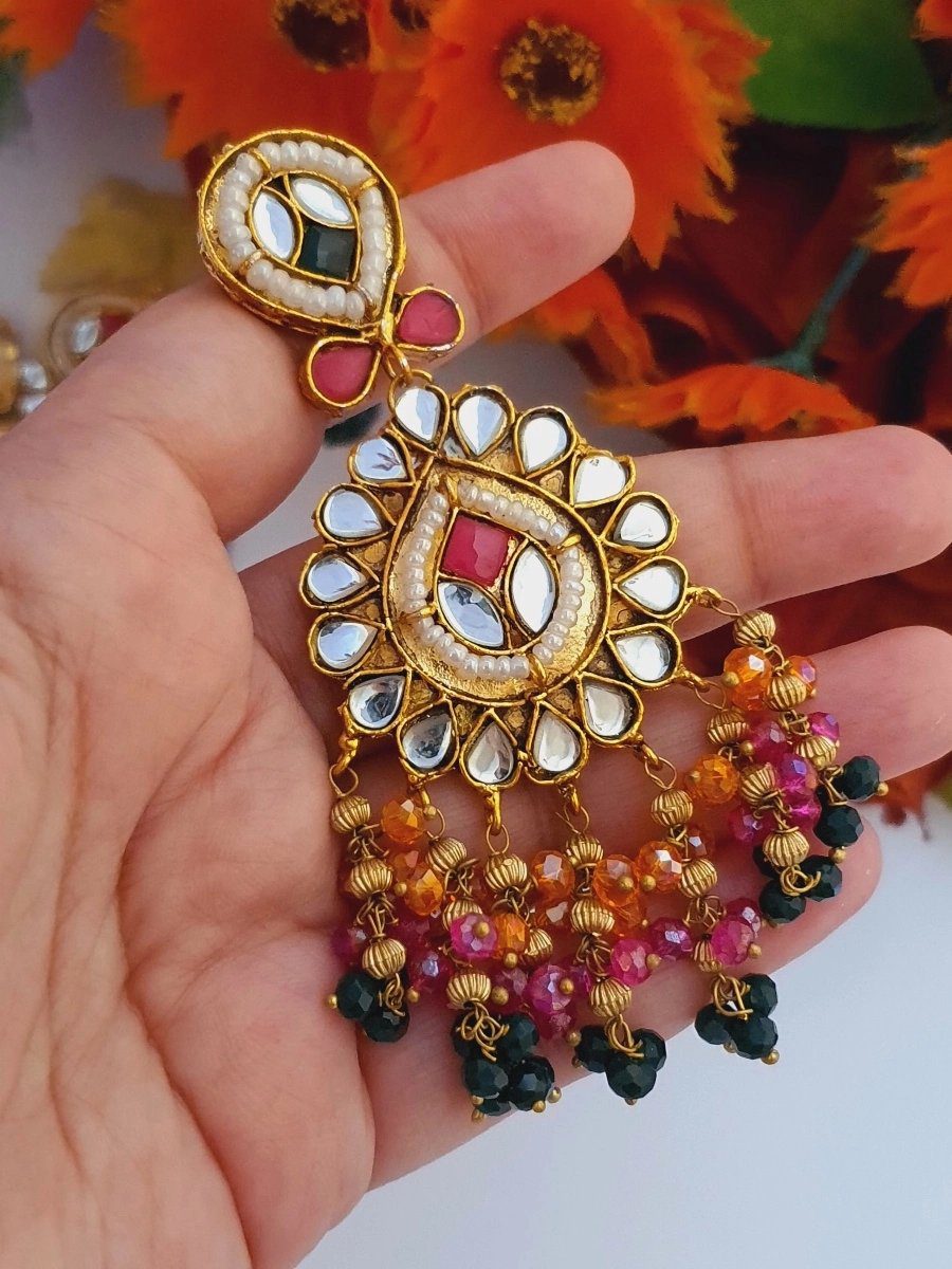 The set includes a matching pair of statement earrings and a bindiya, each featuring cascading beads that mirror the choker’s colorful detailing. Perfect for festive occasions, weddings, or celebrations, this choker set is designed to make a bold style statement and enhance any ethnic outfit with grace and grandeur.