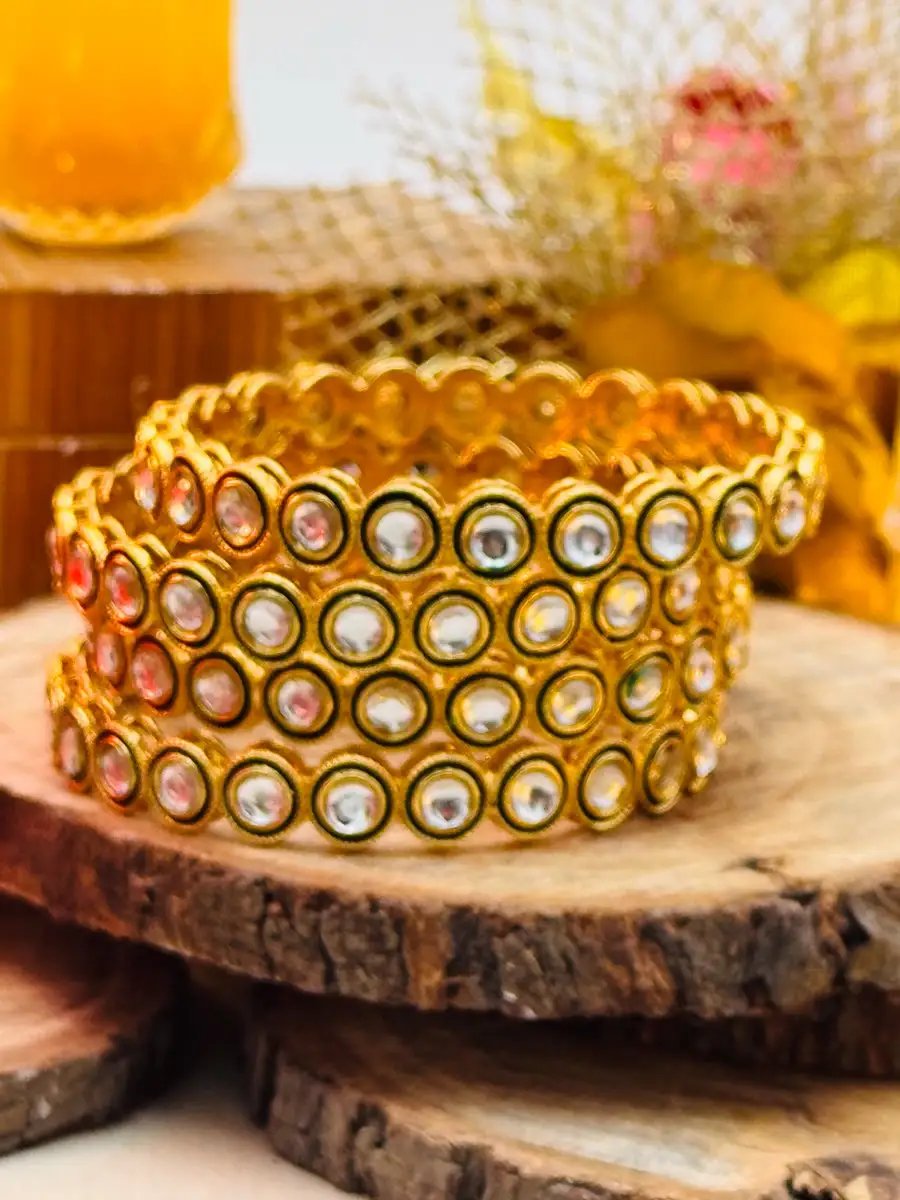 Elevate your ethnic look with this exquisite set of four Jaipuri Kundan bangles, meticulously handcrafted to perfection. These stunning bangles feature classic Jaipuri artistry, showcasing sparkling Polki-style Kundan stones set in a rich gold-tone base. Perfect for weddings, festive occasions, or bridal wear, these bangles bring a royal Rajasthani touch to any outfit.