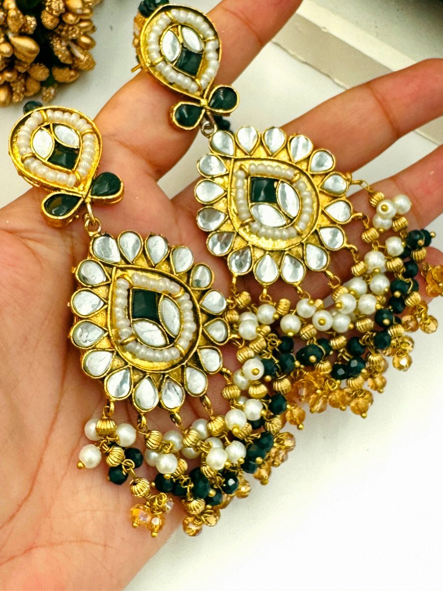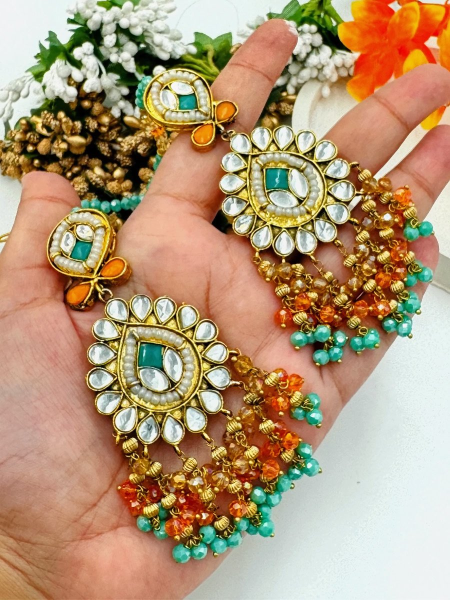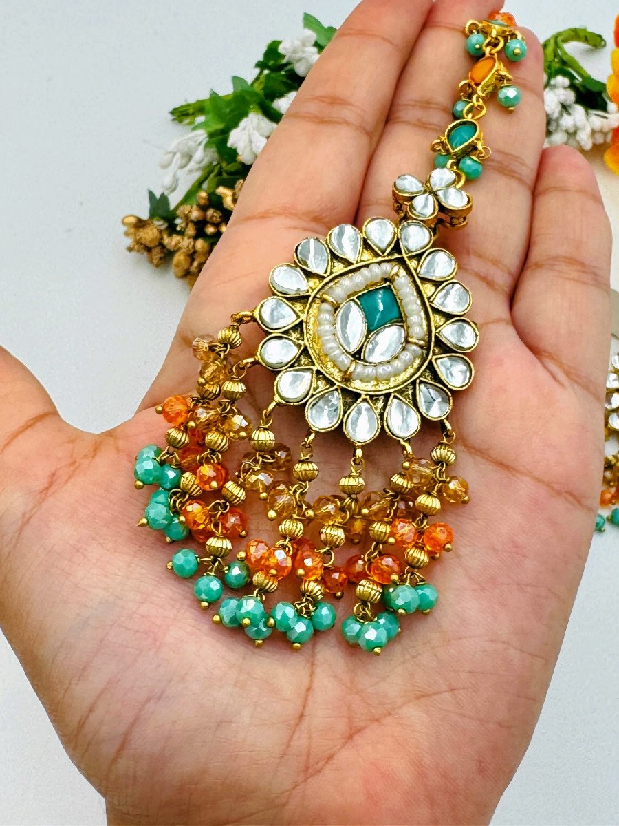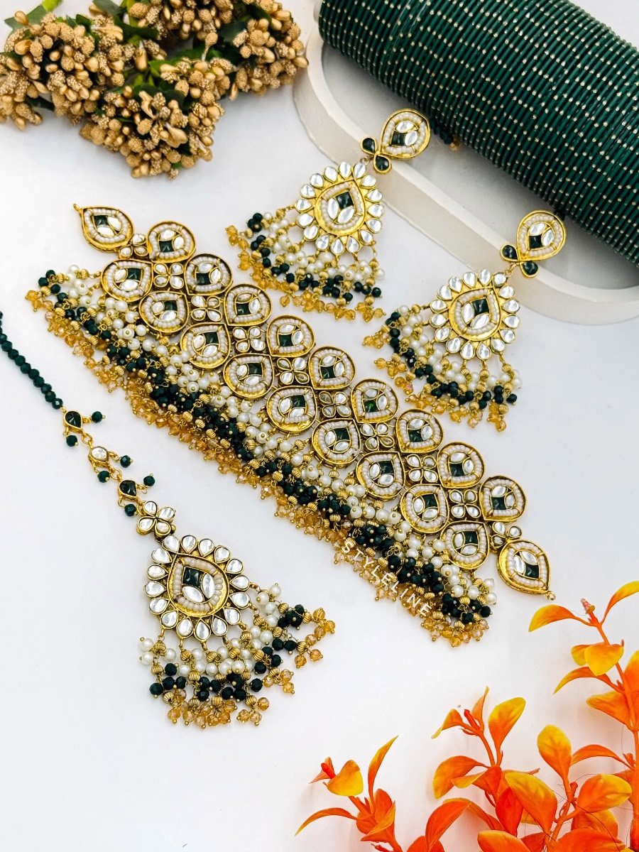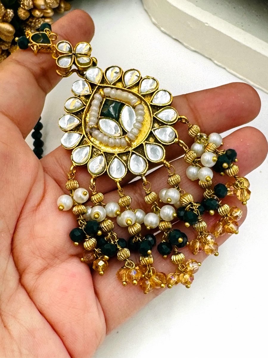 Enhance your elegance with this exquisite Jaipuri Kundan necklace set. Featuring intricate craftsmanship, the set includes a stunning choker-style necklace, adorned with high-quality Kundan stones set in gold-plated metal. Delicate beads hang gracefully along the edges, adding a touch of tradition and sophistication. Matching statement earrings and a bindiya complete the set, making it perfect for weddings, festive occasions, or special events. This necklace set captures the essence of traditional Jaipuri artistry, blending heritage with modern style. Embrace the beauty of handcrafted jewelry and elevate any ensemble with this luxurious set.