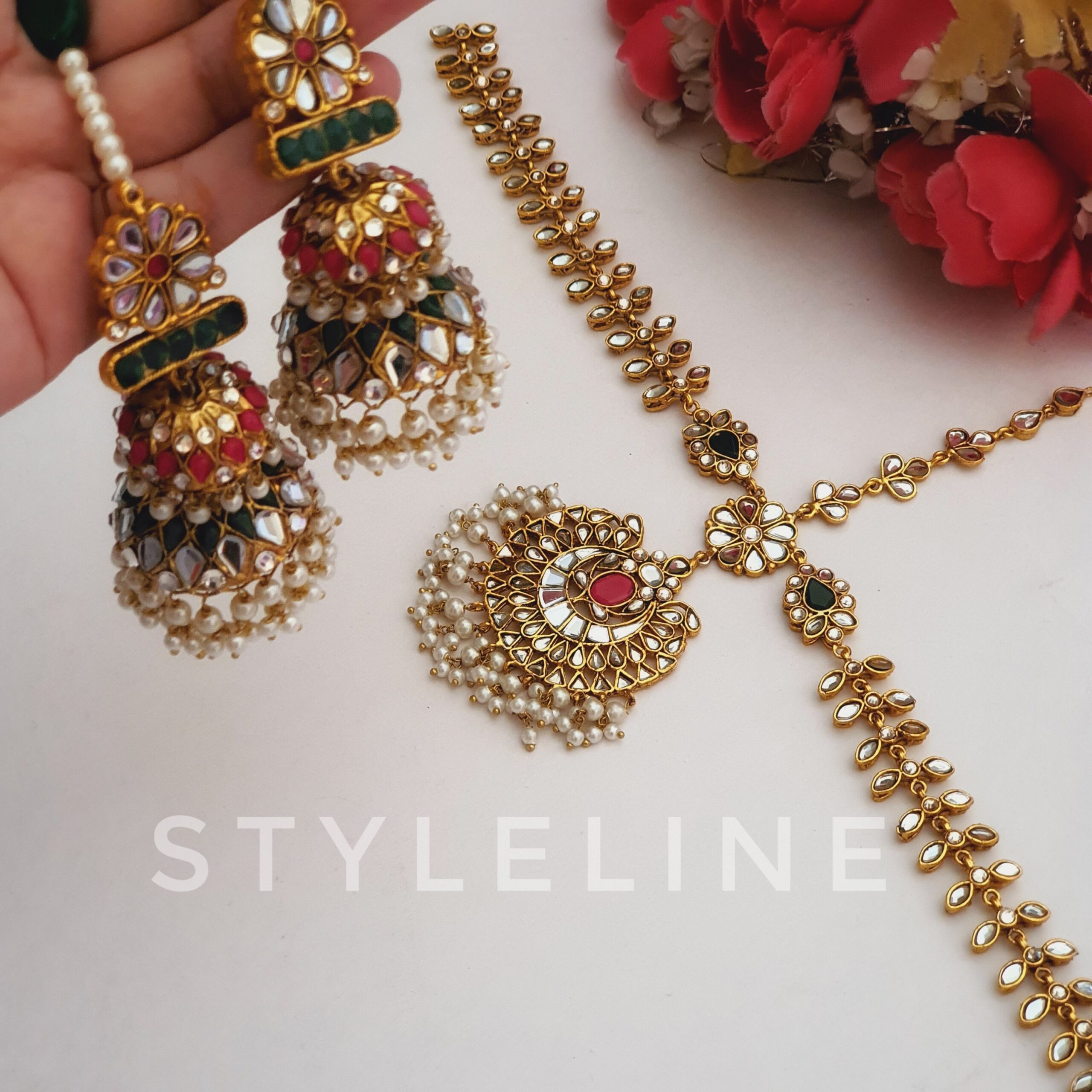 Our best-seller AYEZA headpati jhumki set in mirror work is a perfect choice for this festive season. This set is impeccably designed with captivating details. A must have for any accessory lover!