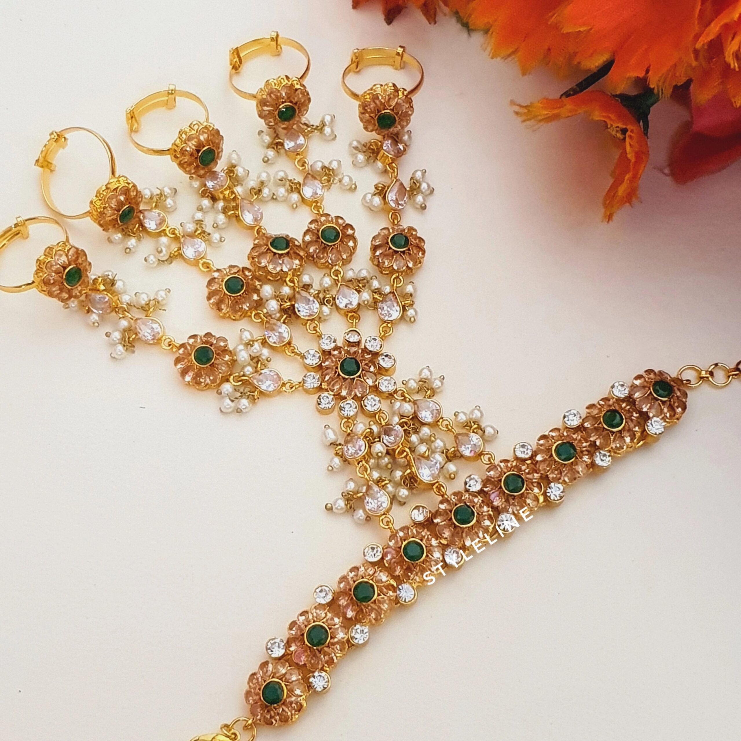 Handcrafted zircon studded hand harness/panjangla perfect for bridal or partywear looks. This stunning harness will add the perfect touch of glamour and grace. Shop yours now!