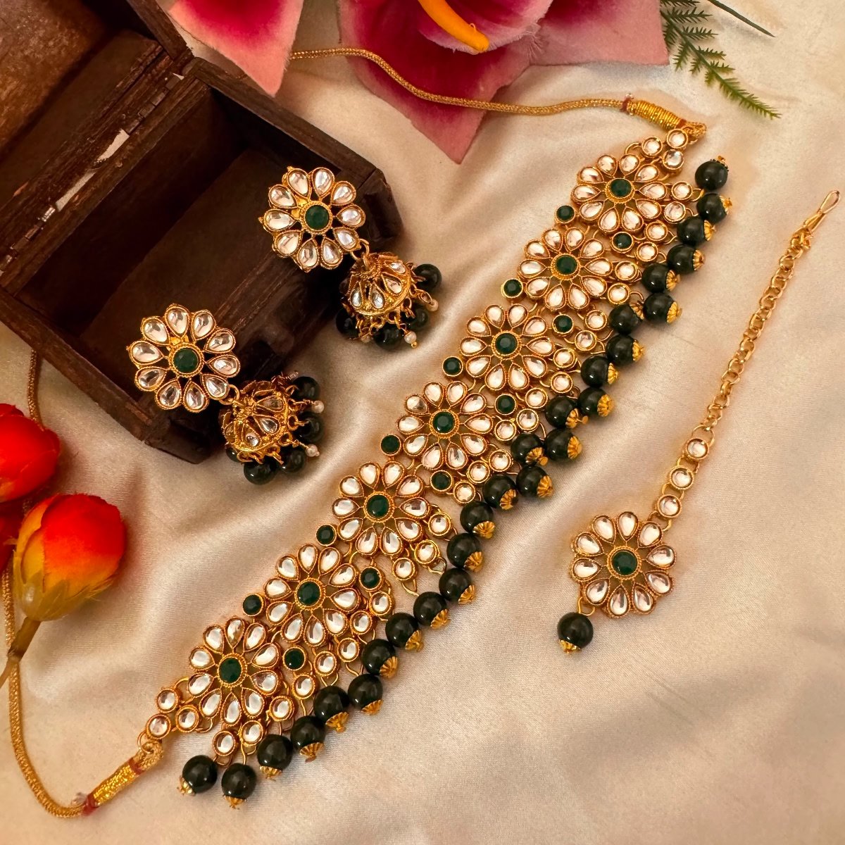 Material: Alloy, kundun, aemi- precious stones