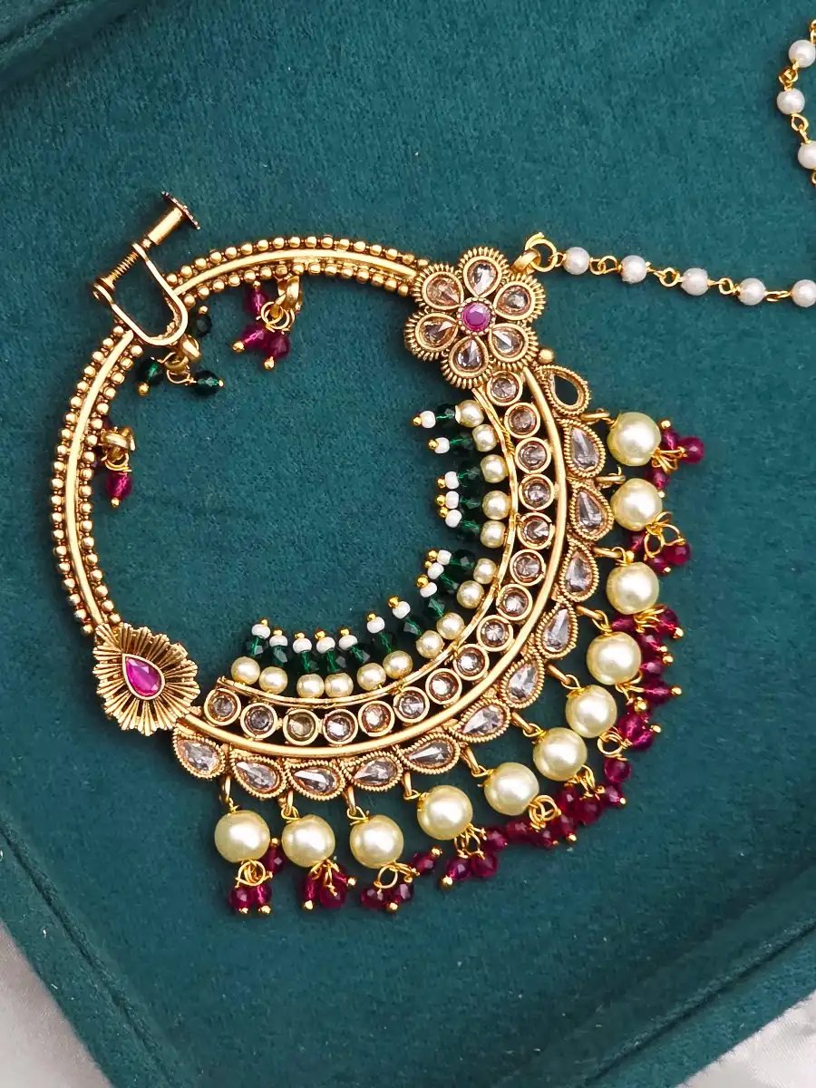 Add regal charm to your bridal ensemble with Styleline’s Premium Bridal Nath, designed for modern brides who desire traditional elegance without the need for piercing. This exquisite nose ring features intricate stone work set in a rich gold-plated finish, beautifully accented with delicate pearls, green and rredish maroon beads.