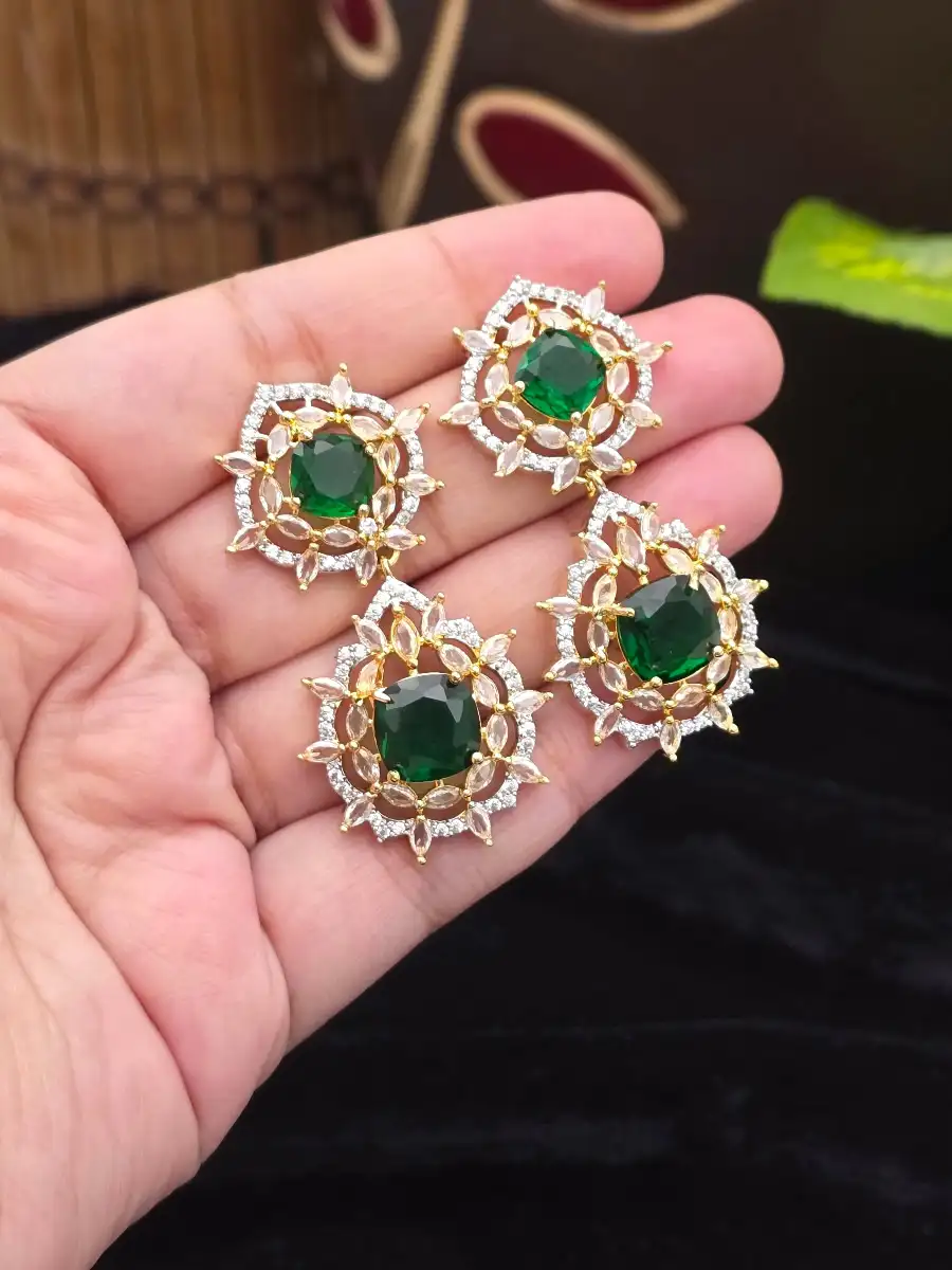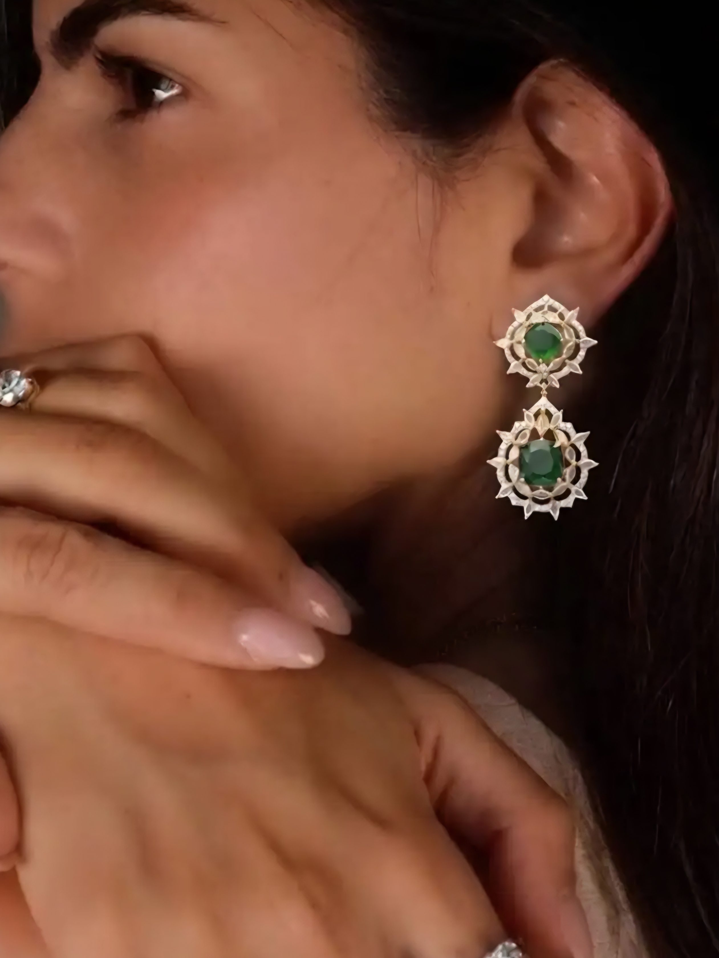 Make a grand entrance with these breathtaking Emerald Green Zircon Drop Earrings. Featuring a rich, cushion-cut faux emerald centerpiece, these earrings are enveloped in a double halo of shimmering white zircons and delicate gold-toned petal accents. The traditional yet contemporary design offers a luxurious “royal” aesthetic without the heavy price tag.