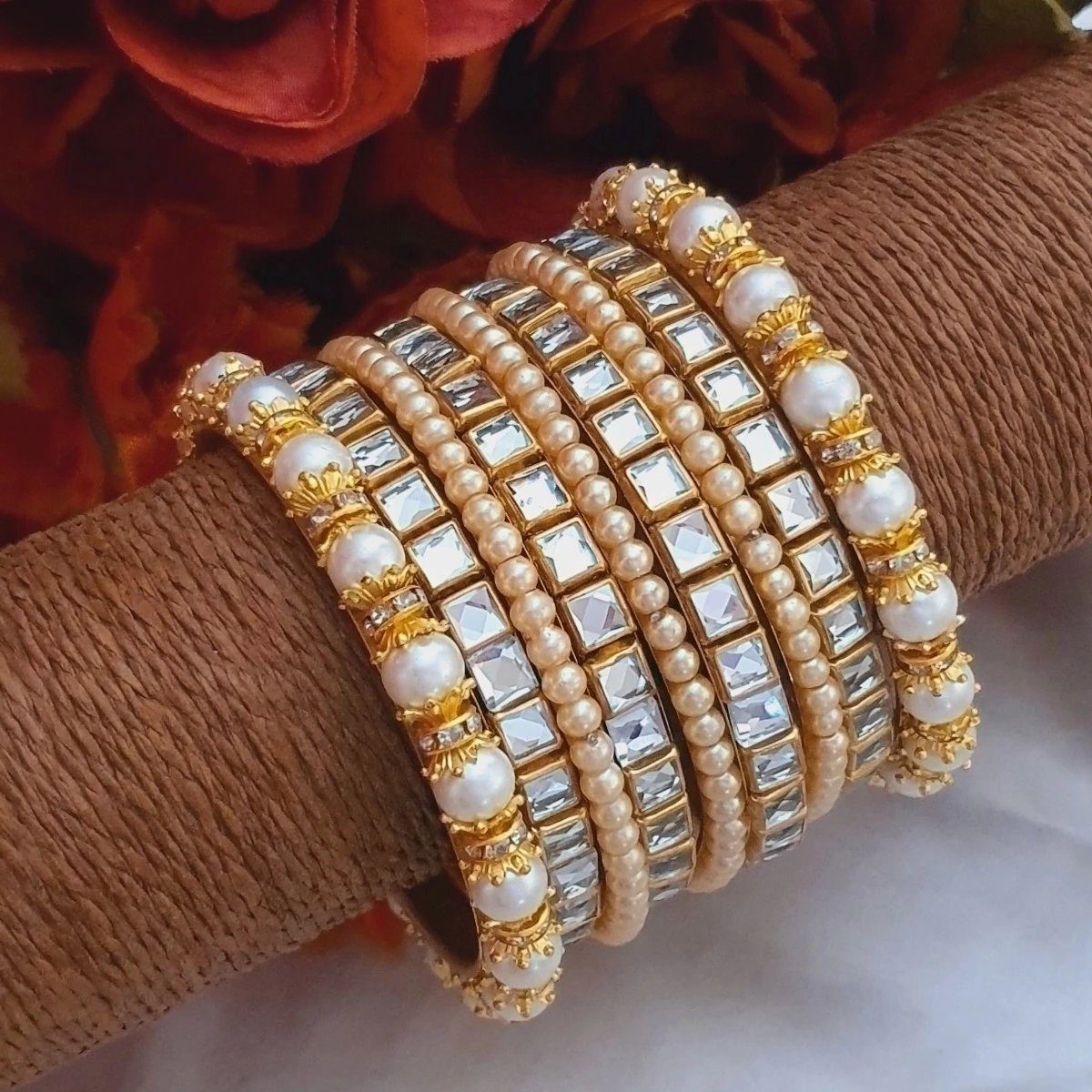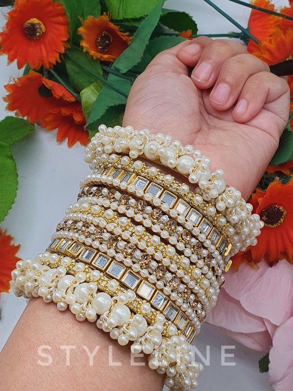 Shine bright at your next party with these handmade gajra pearl bangles. The delicate pearls and intricate design will make you feel confident and glamorous.