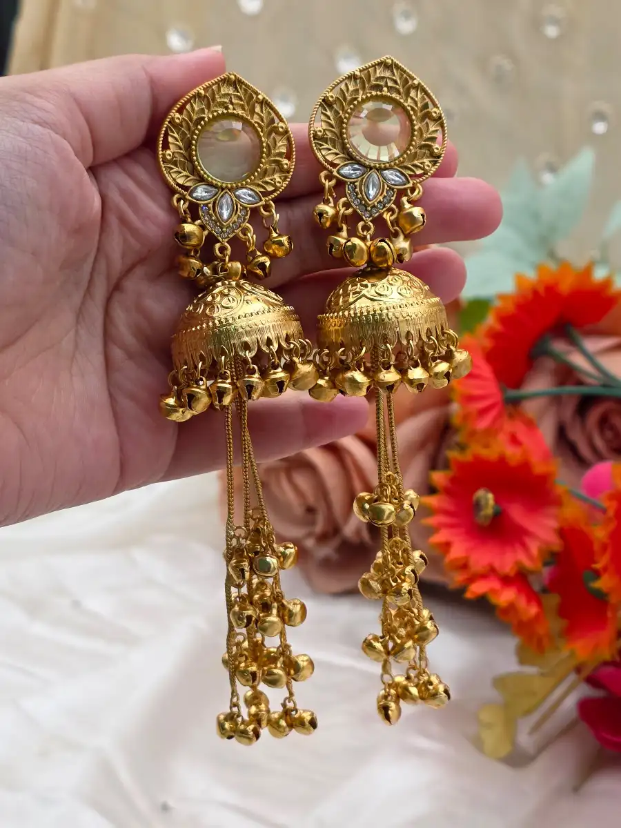 Beautifully handcrafted with intricate gold detailing, statement stone tops, and elegant dome jhumkas adorned with delicate ghungroo tassels. Designed to give a rich, traditional look while remaining lightweight and comfortable to wear.