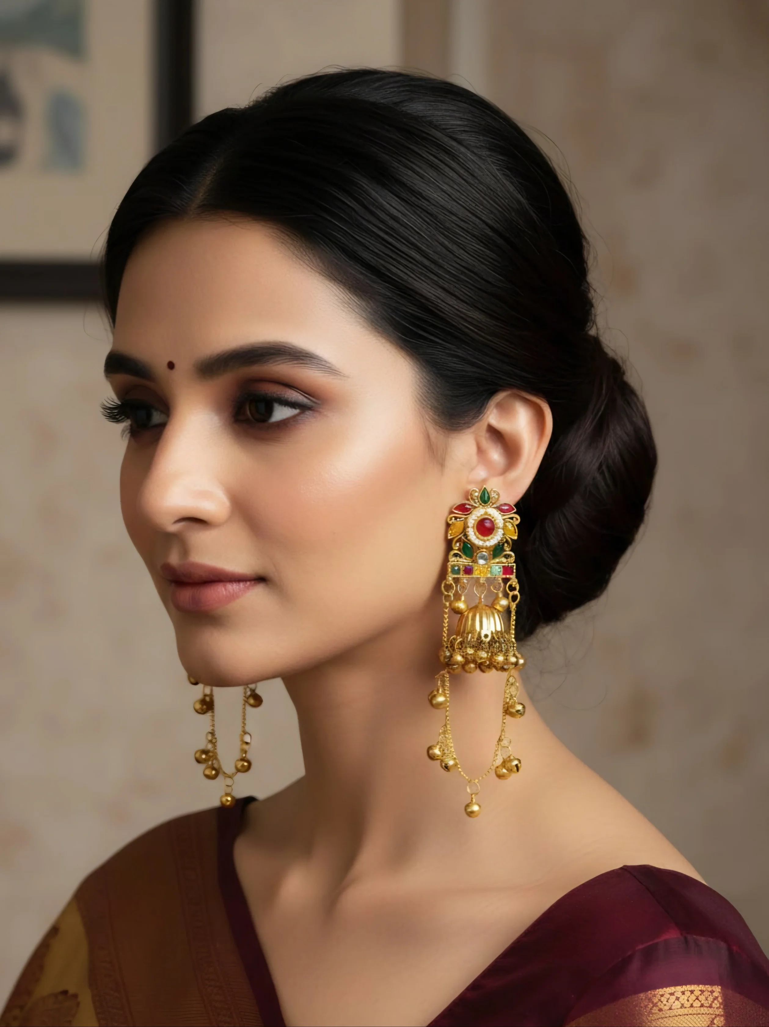 These stunning earrings feature intricately detailed gold-tone metalwork, highlighted with multi stones, finished with graceful dangling elements that add movement and charm. The classic Kashmiri jhumka silhouette offers a regal yet feminine look, making these earrings a standout accessory for any traditional ensemble.