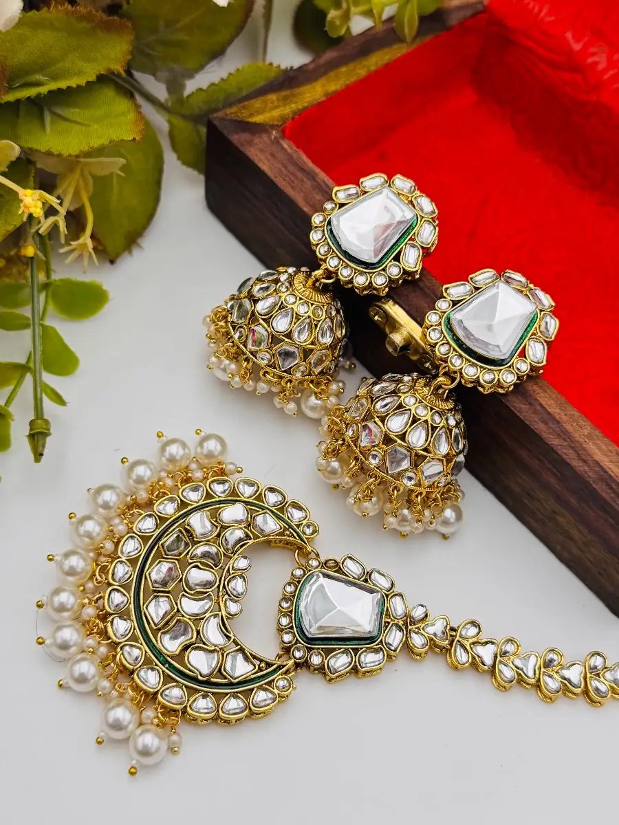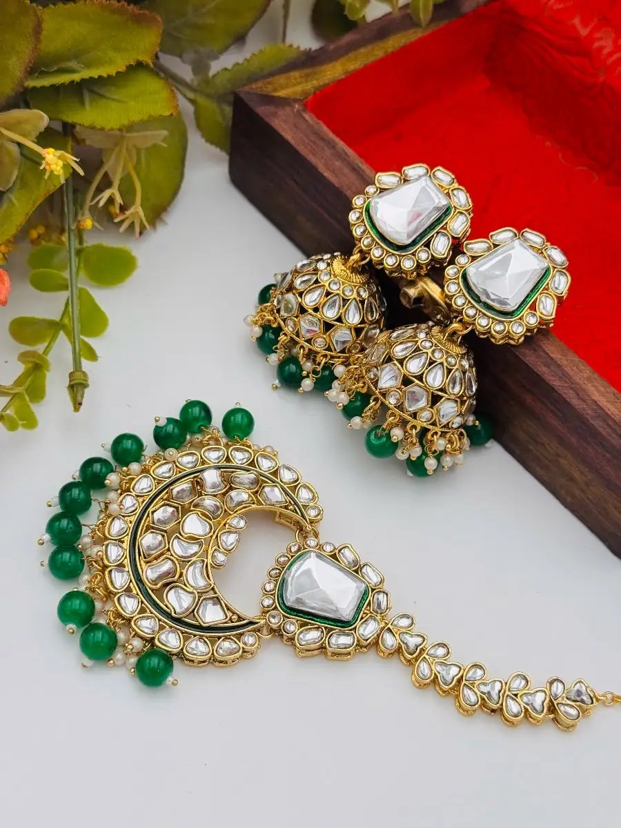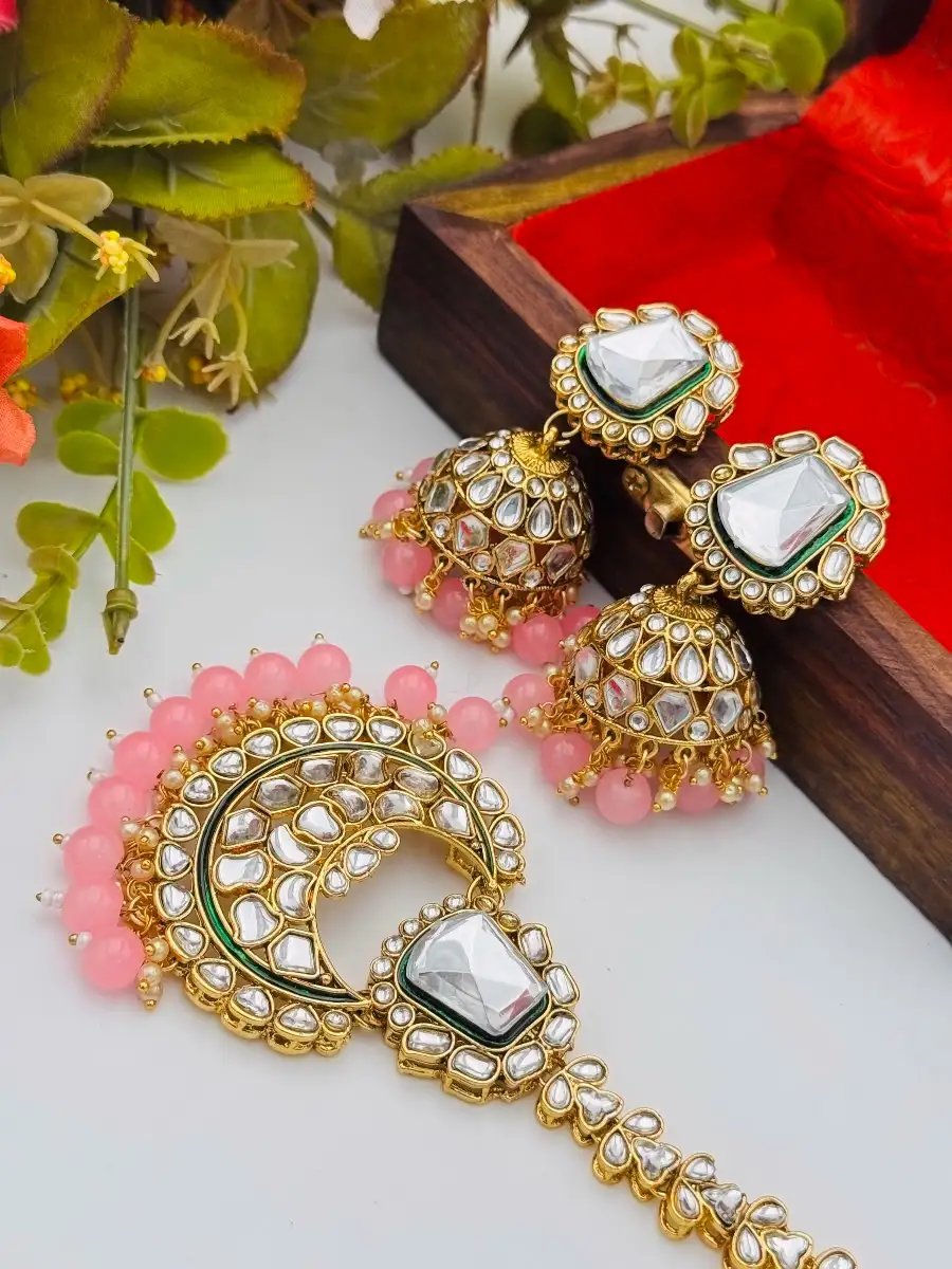 This set includes a beautifully coordinated bindi, seamlessly complementing the earrings to complete your traditional look. The gold-tone base, coupled with shimmering kundan and vibrant maroon stones, radiates elegance and sophistication.