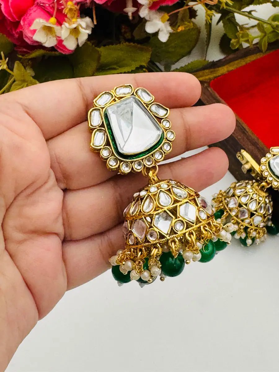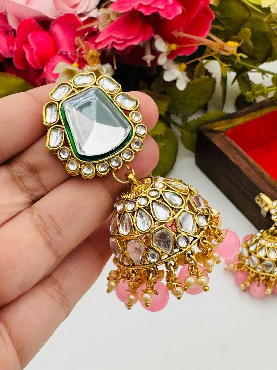 Enhance your ethnic charm with this exquisite Jaipuri Kundan Earrings and Bindi Set. Intricately handcrafted, the earrings feature dazzling uncut kundan stones paired with vibrant maroon accents and delicate pearl detailing. The intricate jhumka design, adorned with traditional craftsmanship, adds a regal touch perfect for festive occasions or weddings.