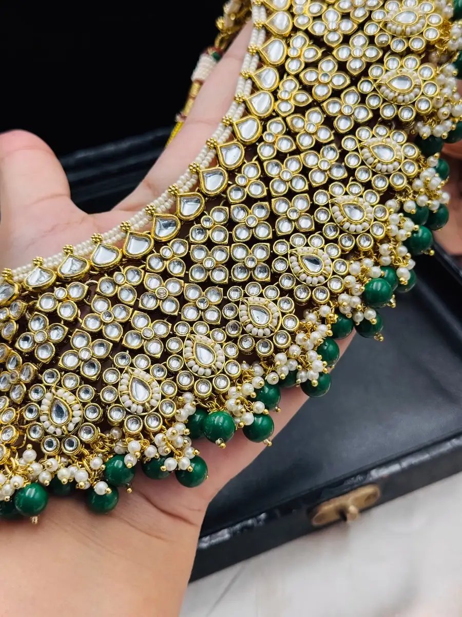 Keywords: kundan bridal set, collar necklace set, sheeshpatti jewelry, jhumka earrings, Indian wedding jewelry, polki kundan, customizable jewelry set, traditional bridal accessories, green bead kundan