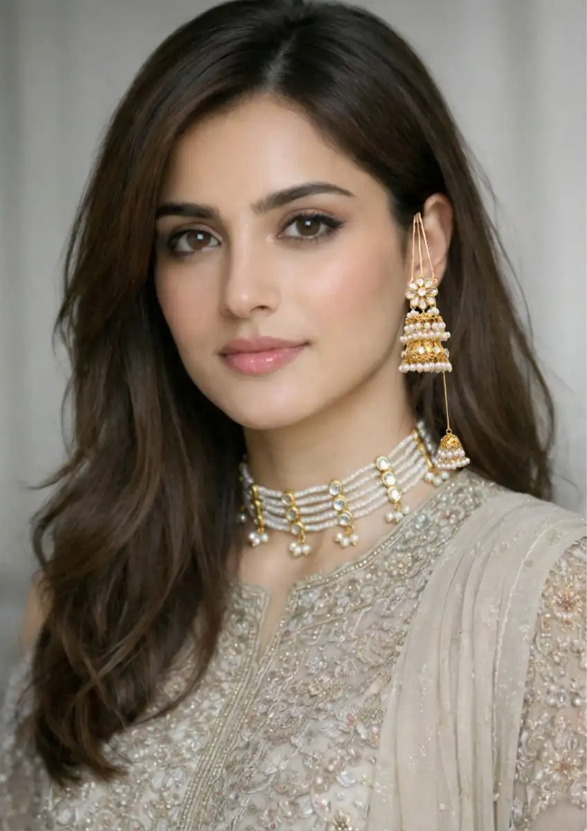 Make a timeless statement with StyleLine’s Pearl Kundan Choker and Jhumki Set, a masterpiece inspired by classic asian jewelry. Crafted with intricate detailing, this elegant set features a multi-strand pearl choker adorned with radiant kundan stones for a regal finish.