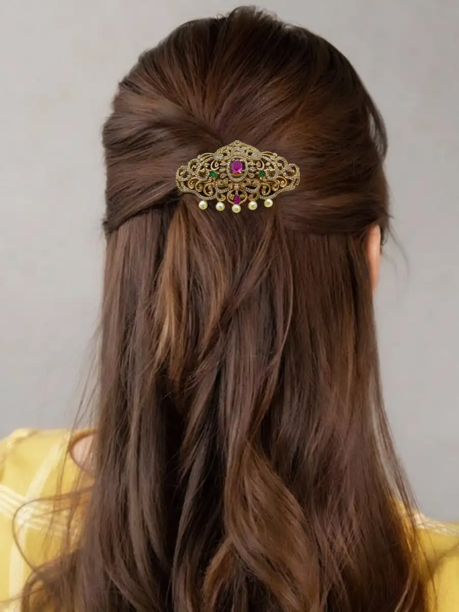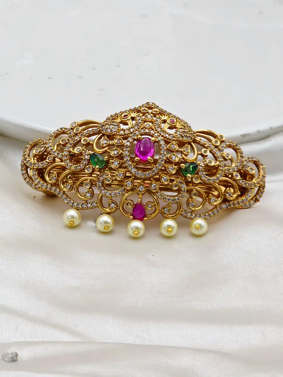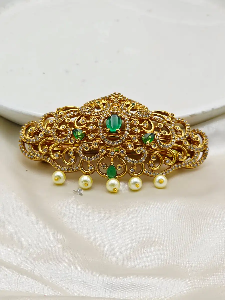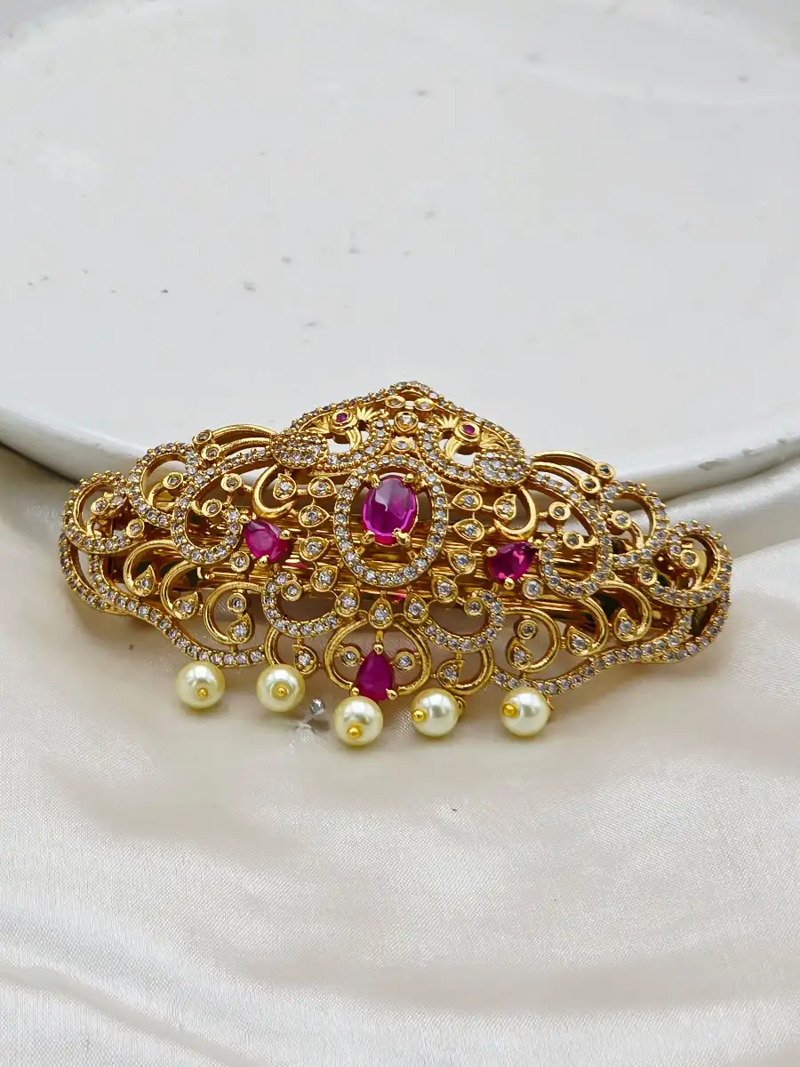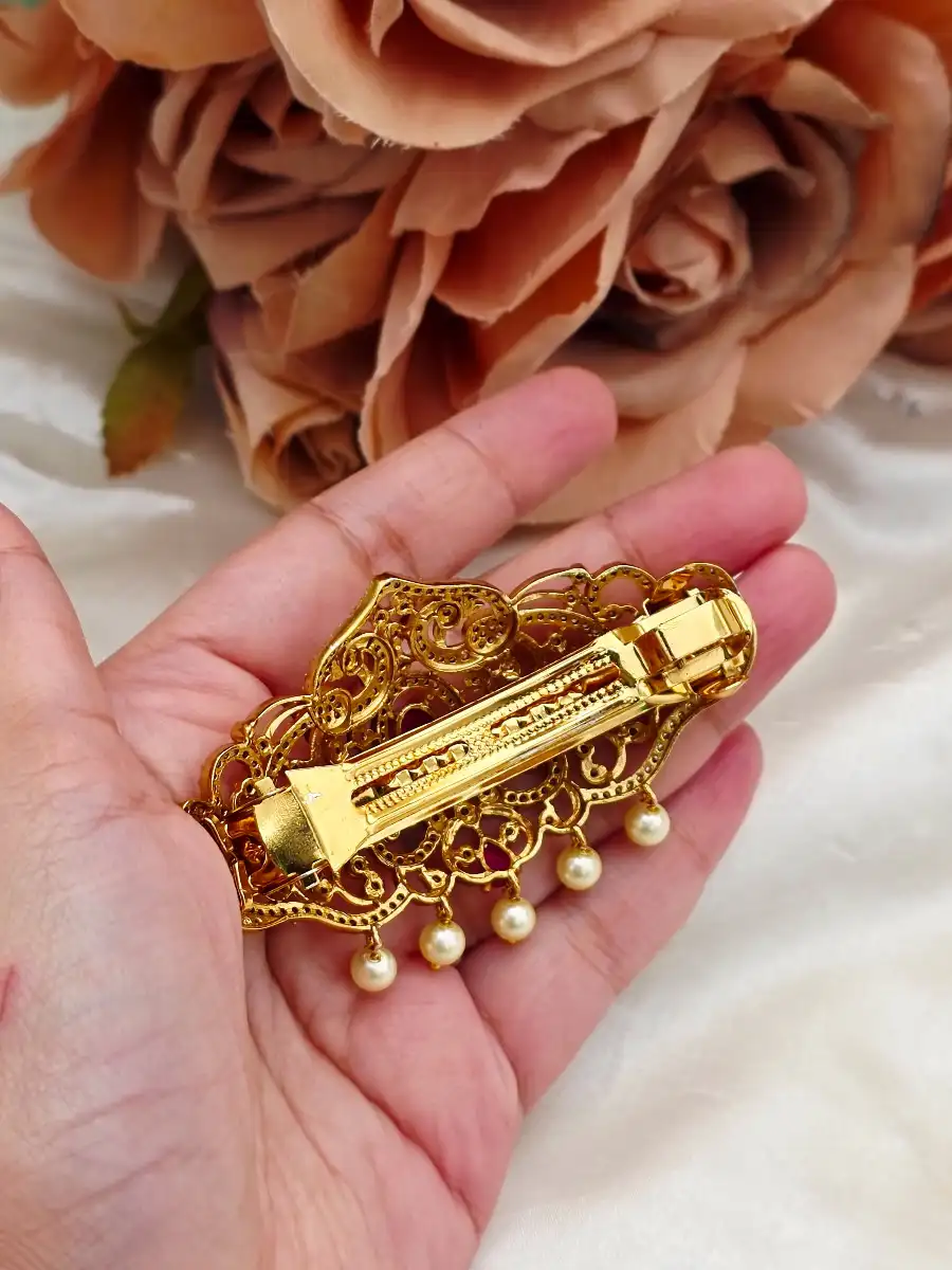 Enhance your bridal look with Styleline’s Premium Quality Zircon Hair Pin, designed to bring timeless Pakistani elegance to your hairstyle. Crafted with an ornate gold-plated base, this exquisite hair accessory showcases finely detailed traditional patterns embellished with high-quality sparkling zircon stones in rich bridal tones, beautifully finished with delicate pearl hangings.