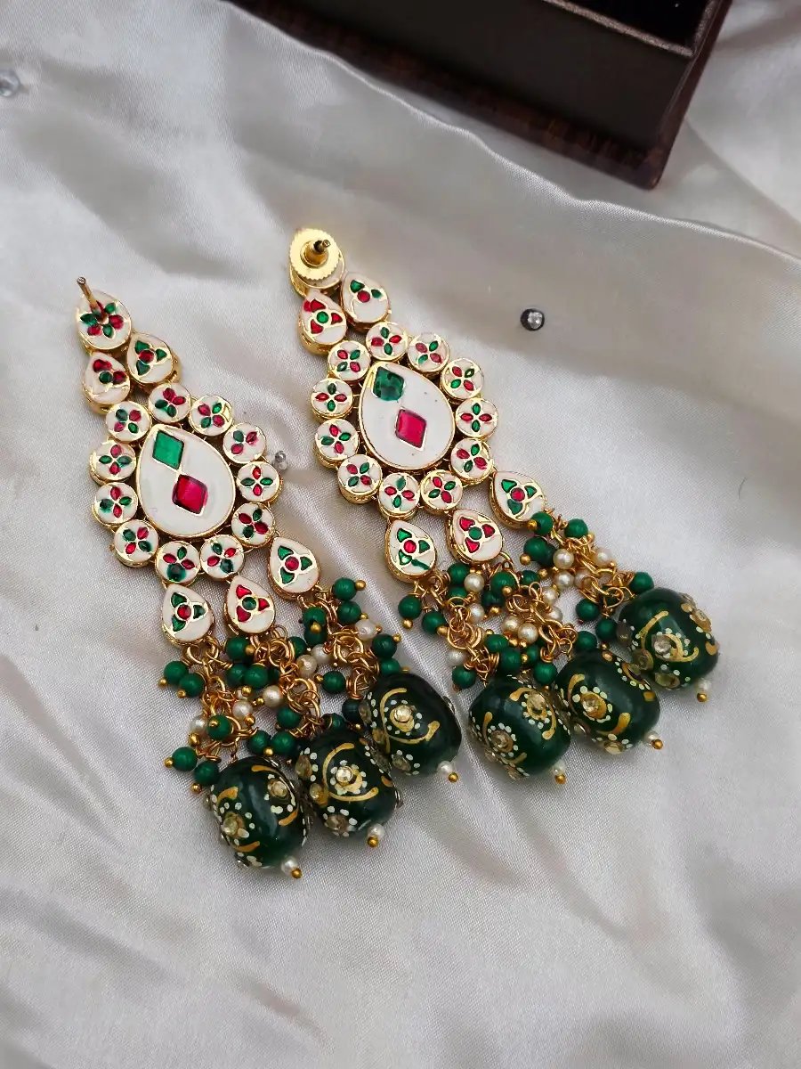 Finished with handcrafted green beaded danglers, these earrings bring movement, color, and regal elegance to your look. The fine meenakari detailing on the reverse makes them as beautiful from the back as they are from the front—perfect for weddings, mehndi functions, dholki events, and festive gatherings.