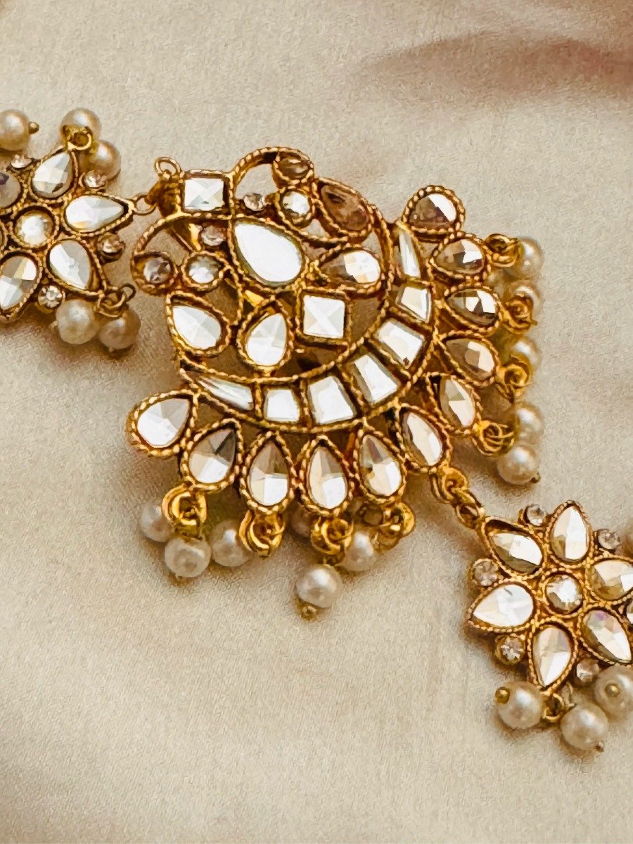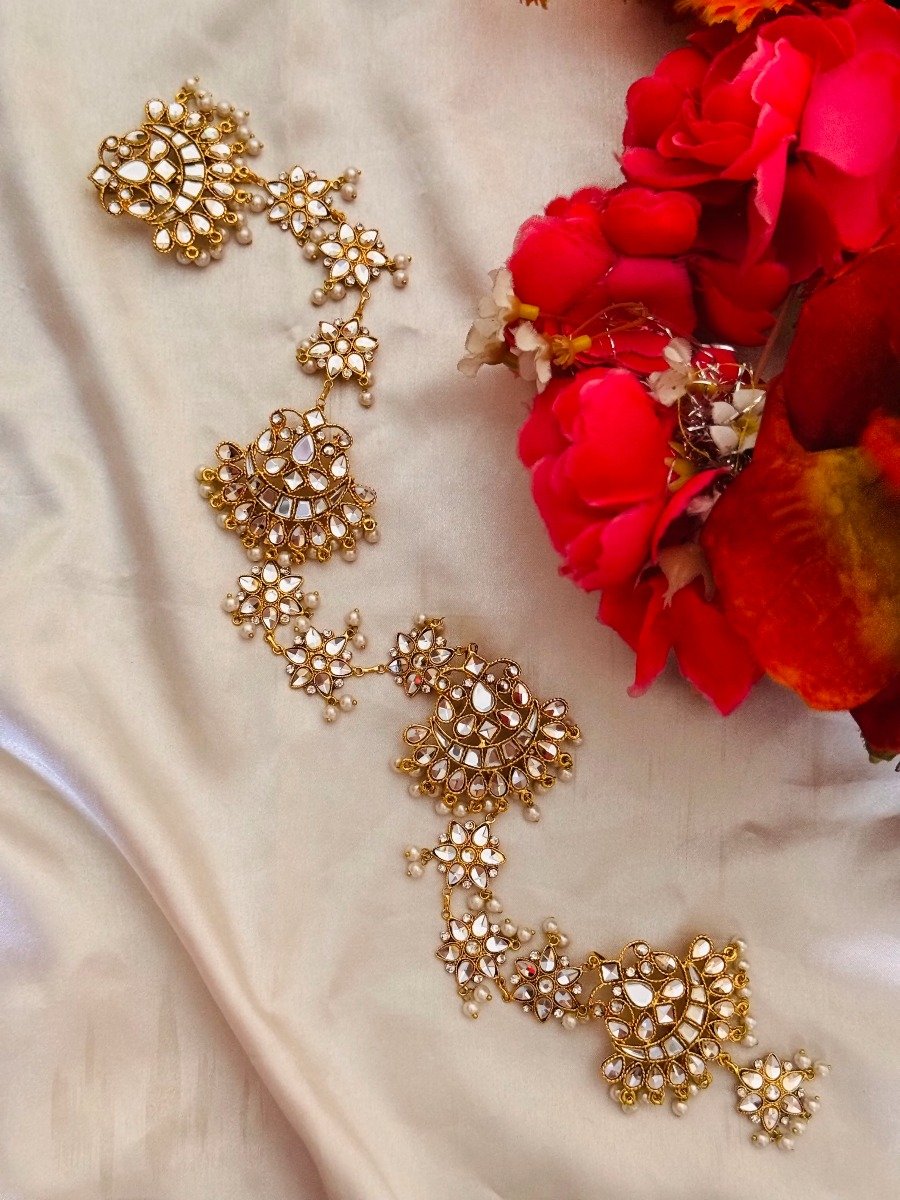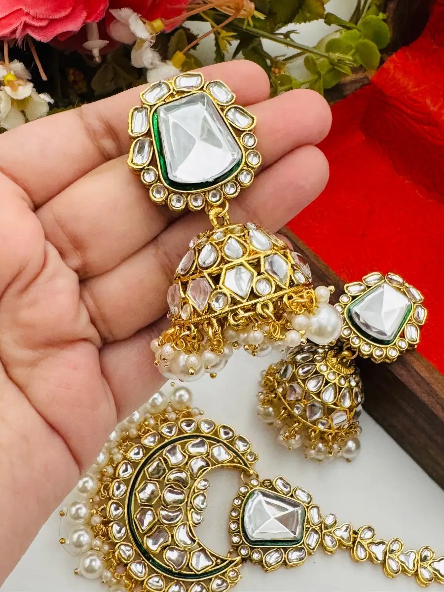 Elevate your traditional look with this exquisite Jaipuri Kundan earrings and bindiya set, a masterpiece of timeless artistry and elegance. Meticulously handcrafted, this set features dazzling Kundan stones set in intricate gold-tone detailing, perfectly complemented by pearl bead accents for a regal touch.