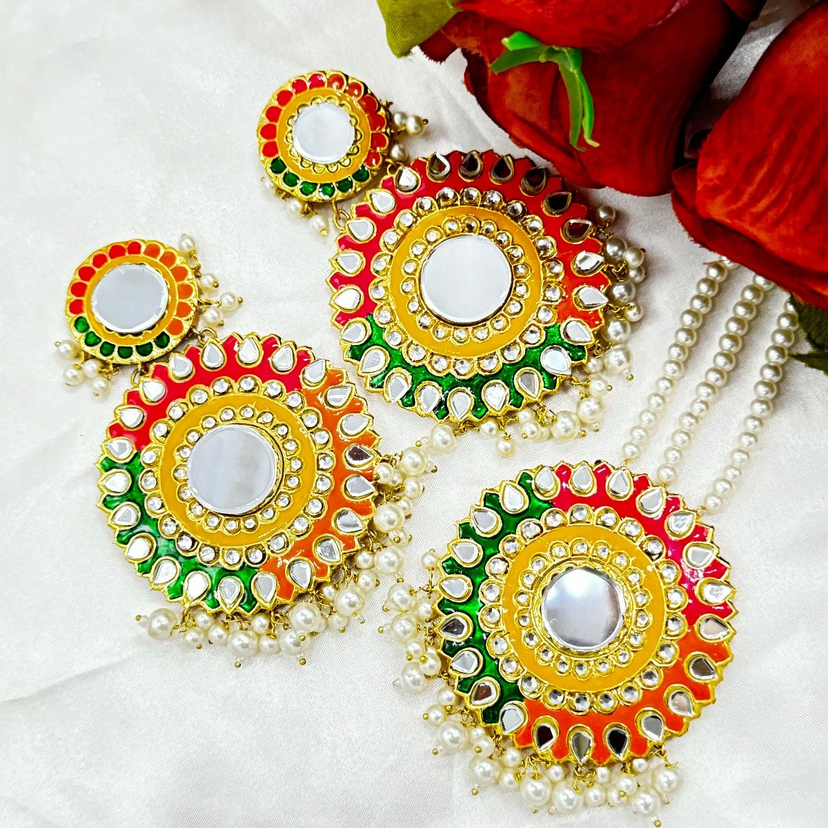 Elevate your party look with our exquisite traditional colorful earrings and bindi set. Stand out with vibrant hues and intricate designs, perfect for any special occasion. Complete your outfit with this stunning accessory set that effortlessly combines tradition and style.