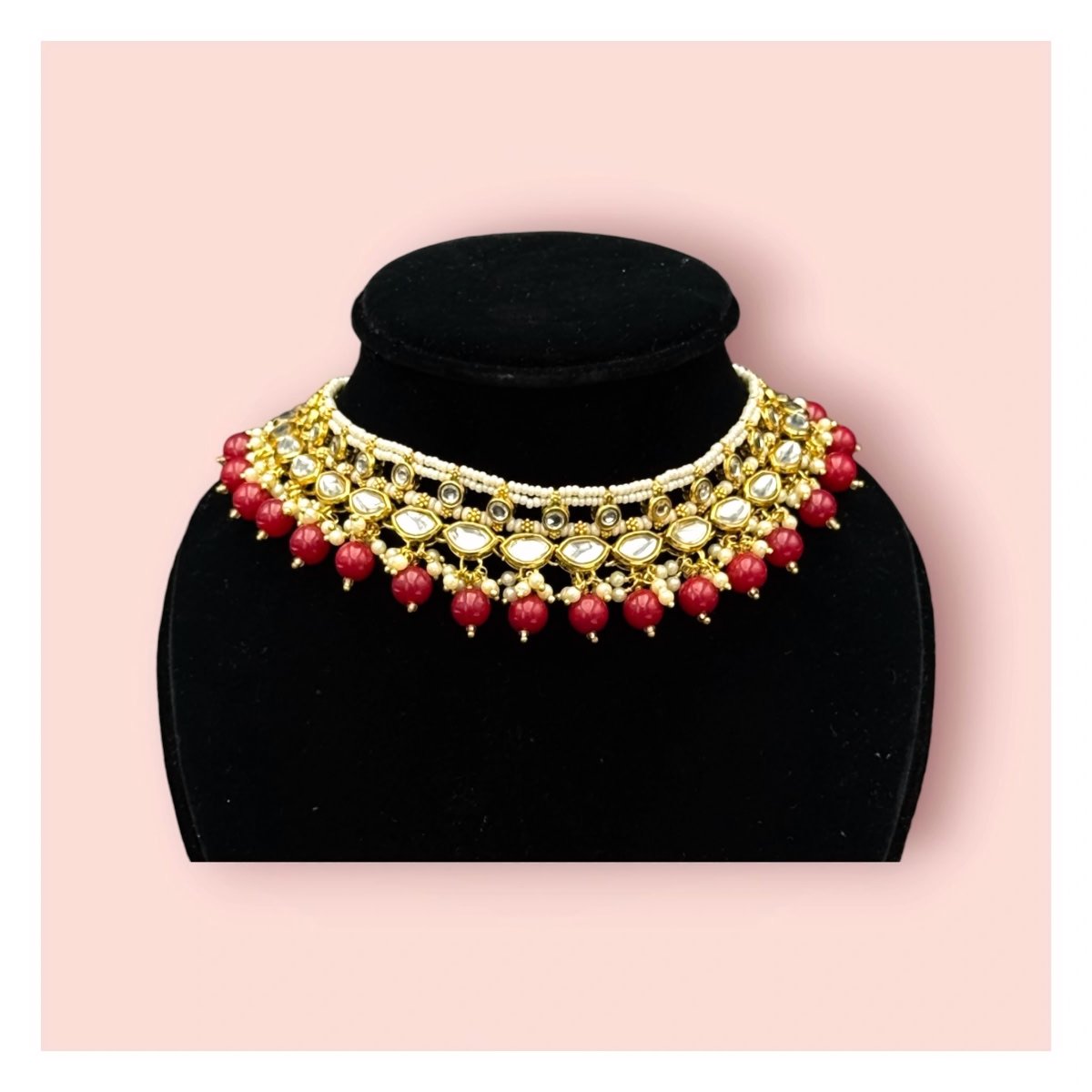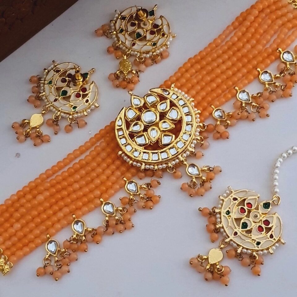 Enhance your elegance with this exquisite Jaipuri choker set, crafted to capture the royal essence of traditional Indian jewelry. This choker features intricate detailing with delicate gold plating, adorned with unblemished white stones that reflect light beautifully. The unique design is complemented by dainty pearl accents and maroon beads, adding a touch of sophistication and charm. Perfect for weddings, festivities, or any special occasion, this choker seamlessly blends heritage with contemporary style. Pair it with matching earrings to complete your look and make a regal statement.