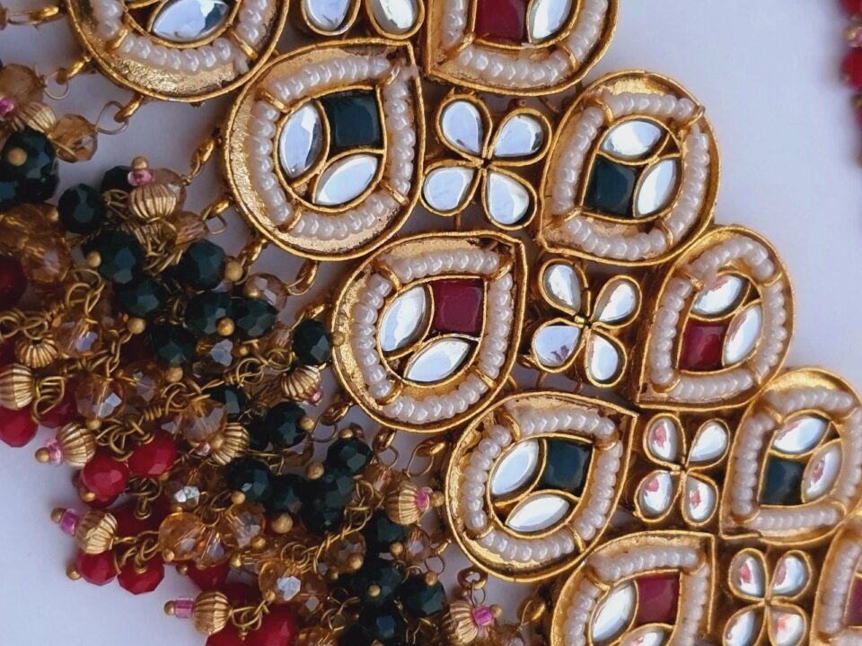 Enhance your elegance with this exquisite Jaipuri choker set, crafted to capture the royal essence of traditional Indian jewelry. This choker features intricate detailing with delicate gold plating, adorned with unblemished white stones that reflect light beautifully. The unique design is complemented by dainty pearl accents , adding a touch of sophistication and charm. Perfect for weddings, festivities, or any special occasion, this choker seamlessly blends heritage with contemporary style. Pair it with matching earrings to complete your look and make a regal statement.