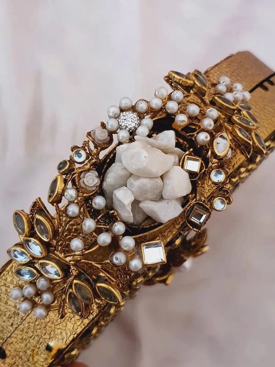 – **Sides:** Decorated with ornate elements and pearl clusters, adding a regal touch to the design.