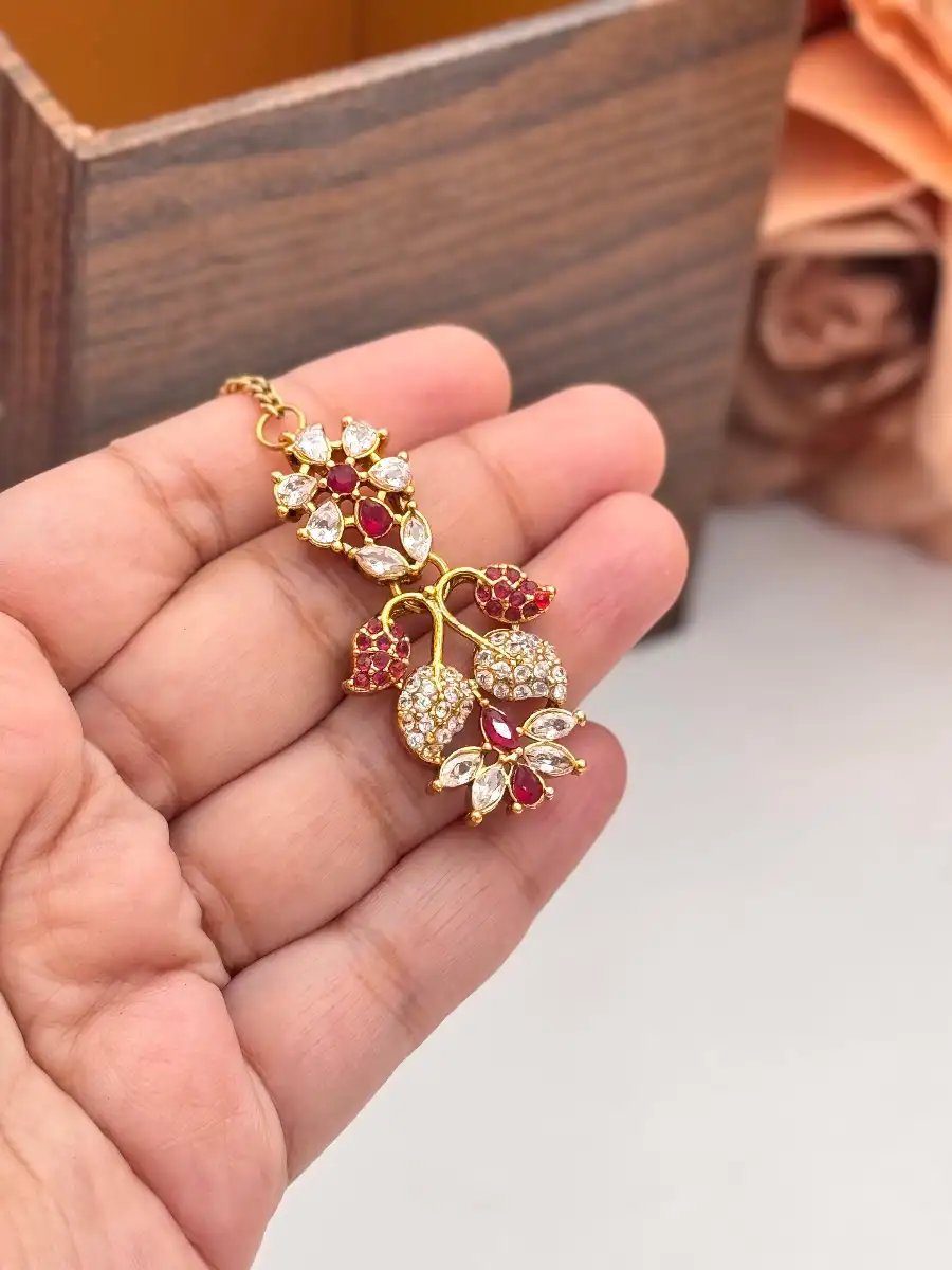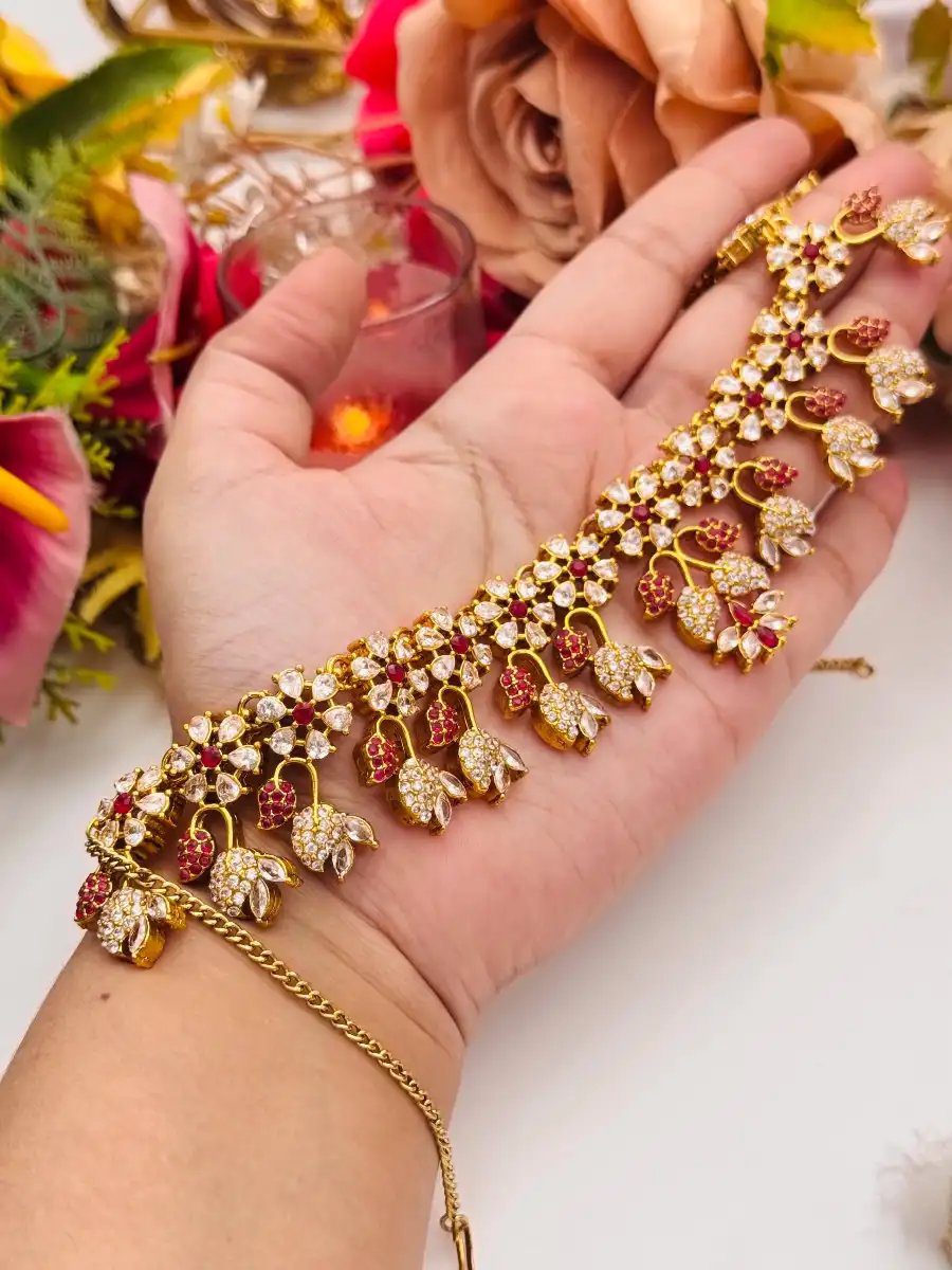Discover refined luxury with Styleline’s Zircon Necklace Set, designed to elevate traditional formal looks. This exquisite set showcases high-quality zircon stones, delicately arranged in a floral and vine-inspired pattern, highlighted with rich maroon stone detailing for a regal finish.