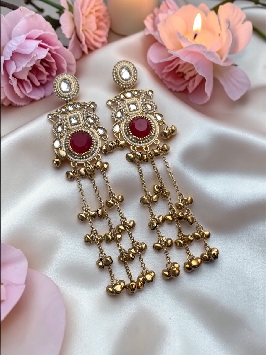 Add timeless elegance to your look with StyleLine’s Kashmiri earrings, featuring a rich maroon center stone, delicate kundun and pearl detailing, and charming ghungroo tassel drops. Perfect for Eid, weddings, festive occasions, and traditional wear in Pakistan.