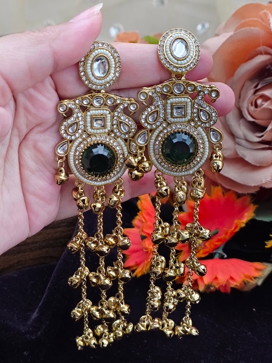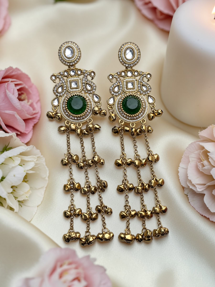 Add timeless elegance to your look with StyleLine’s Kashmiri earrings, featuring a rich green center stone, delicate kundun and pearl detailing, and charming ghungroo tassel drops. Perfect for Eid, weddings, festive occasions, and traditional wear in Pakistan.