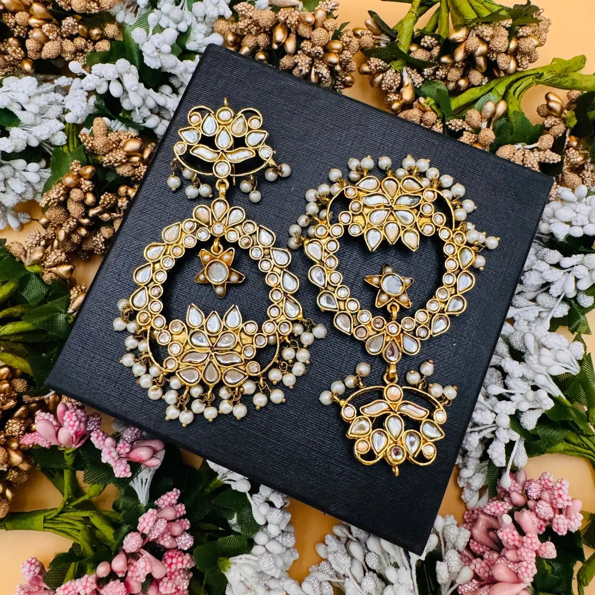 Elevate your style with these breathtaking mirror work earrings, a perfect blend of traditional artistry and modern elegance. Crafted with intricate kundan mirror work and delicate pearl embellishments, these earrings embody regal charm. The floral and paisley motifs enhance their timeless appeal, making them an ideal choice for weddings, festive occasions, and statement looks.