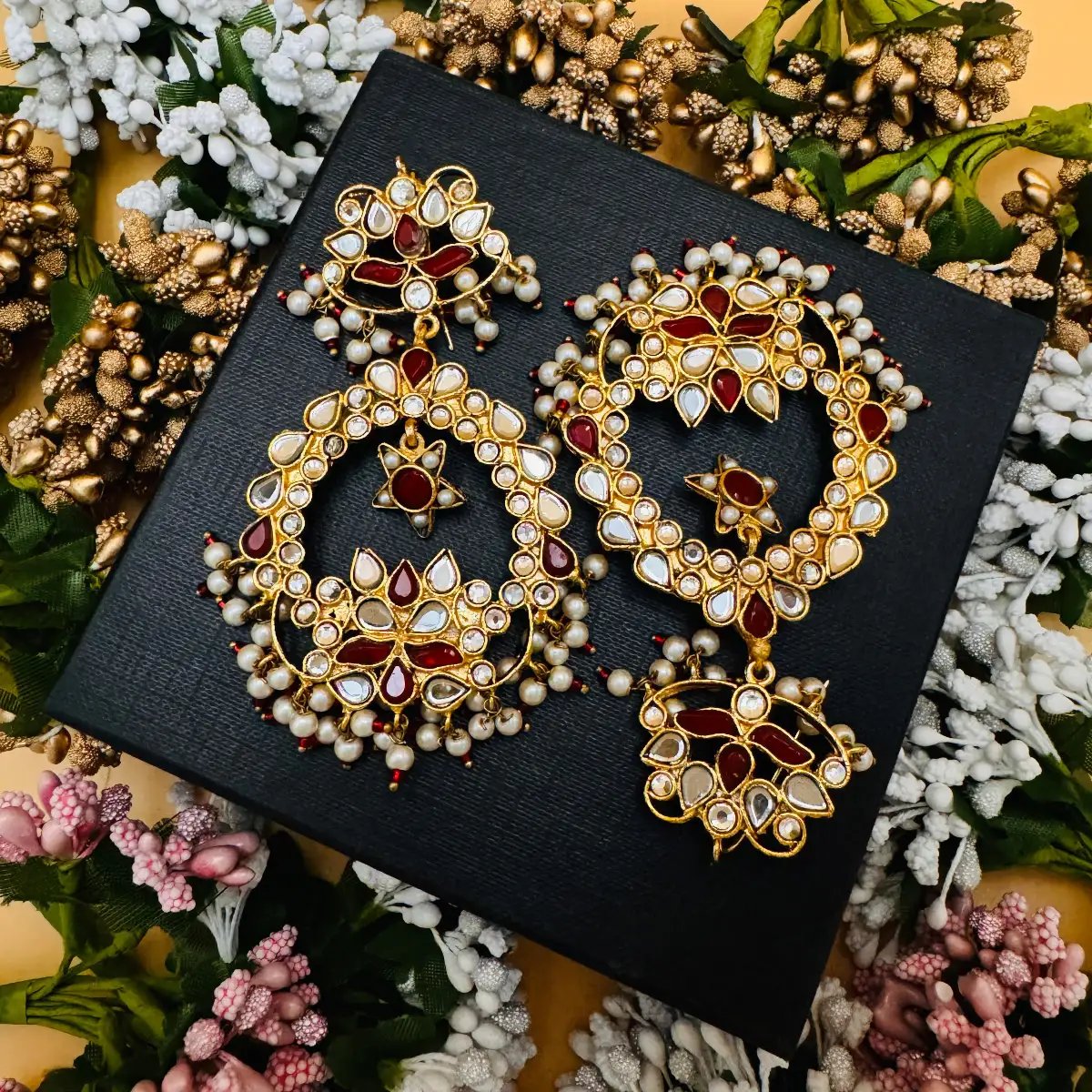 Elevate your style with these breathtaking mirror work earrings, a perfect blend of traditional artistry and modern elegance. Crafted with intricate kundan mirror work, rich ruby-red accents, and delicate pearl embellishments, these earrings embody regal charm. The floral and paisley motifs enhance their timeless appeal, making them an ideal choice for weddings, festive occasions, and statement looks.