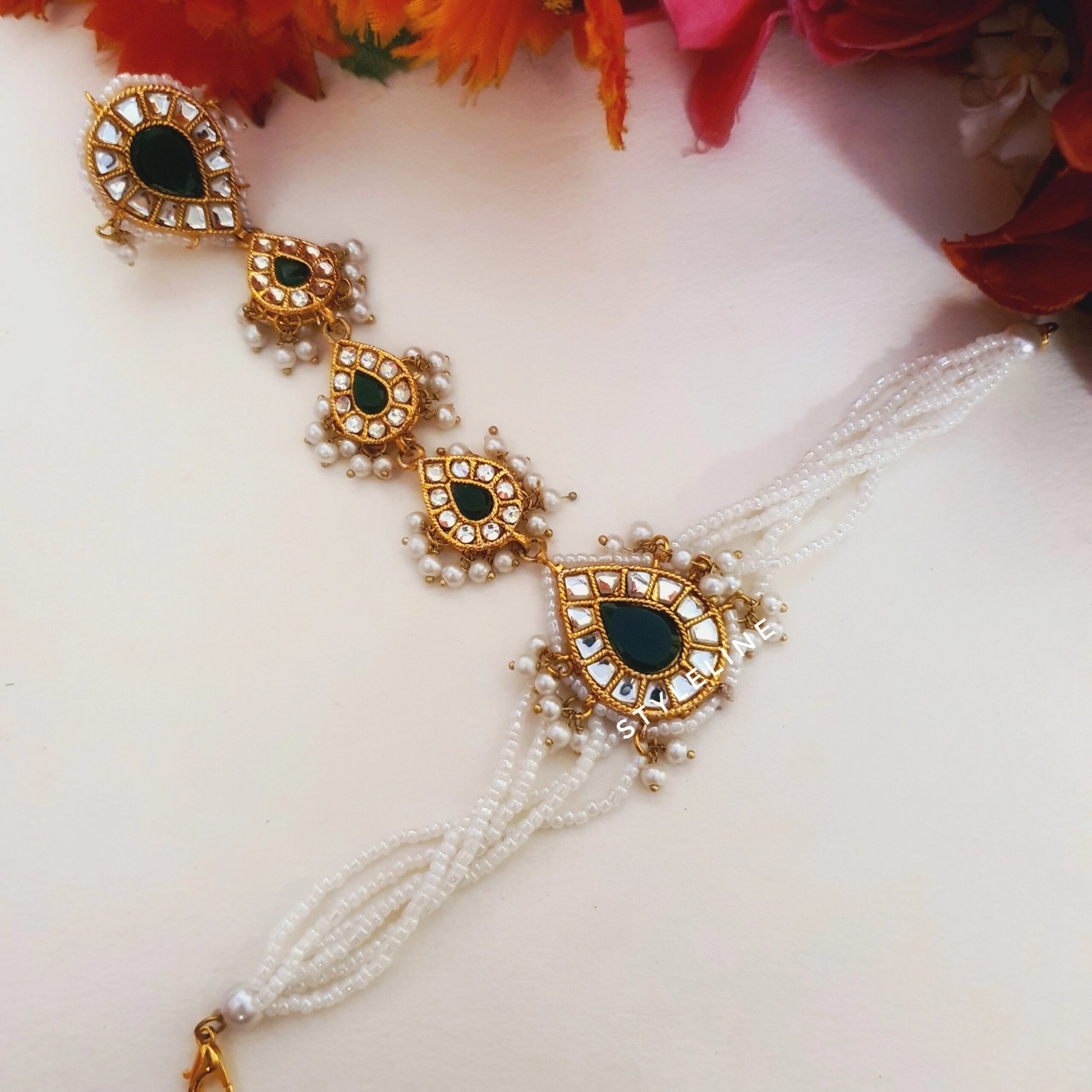 TARA hand harness is a perfect hand piece for the timeless and elegant look. This traditional yet stylish hand harness is definitely going to steal the limelight. Handmade with high quality brass and material is surely a perfect fit for a queen like you.