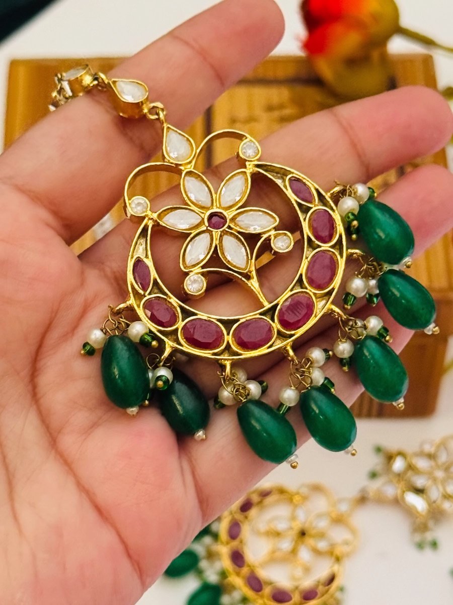 Introducing our stunning 22k Farshi Kundan Earrings and Bindi Set, designed to add timeless elegance to any outfit. These handcrafted pieces feature intricate floral motifs with a crescent moon-shaped Kundan design, adorned with deep green drops and delicate white zircon stones. Perfect for weddings or festive occasions, this set blends traditional craftsmanship with regal aesthetics, ensuring you stand out with its luxurious appeal.