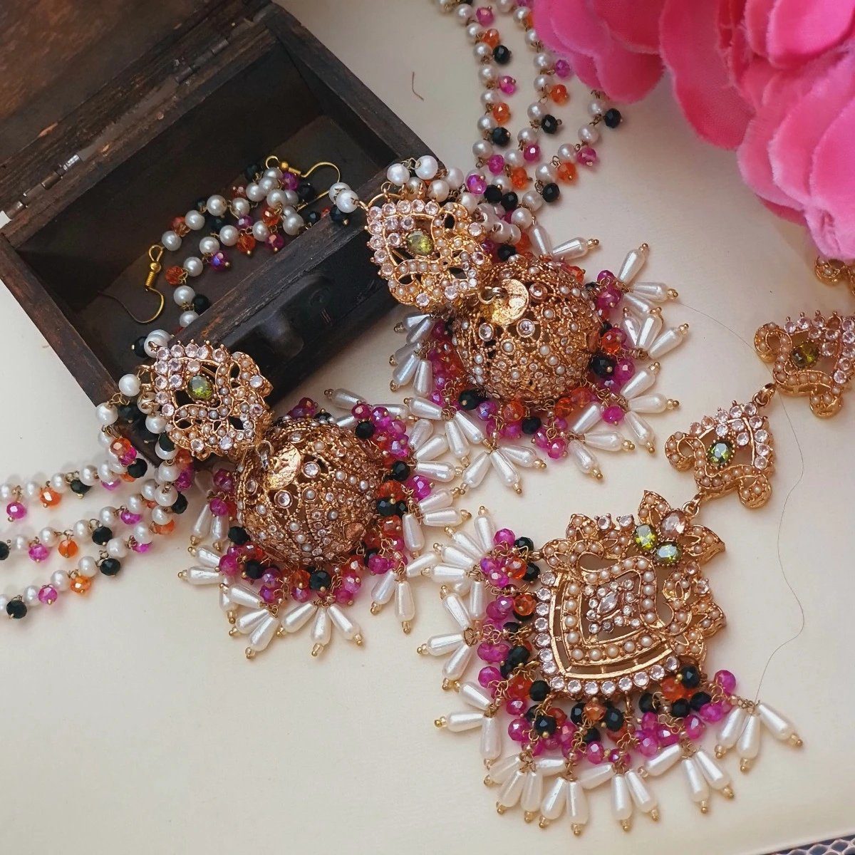 A stunning celebration of craftsmanship and elegance, this traditional handmade earrings bindi set embodies timeless beauty and sophistication. Each meticulously crafted piece is a true work of art, showcasing intricate detailing and exquisite design. Adorn yourself with this exquisite set and make a statement at any special occasion. Elevate your style and express your unique personality with this enchanting and luxurious accessory that will surely turn heads and make you the center of attention.