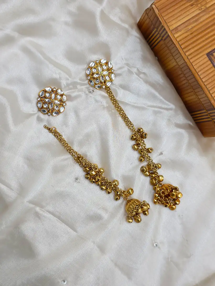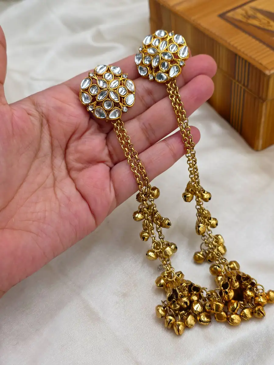 The intricate kundan detailing, delicate bead accents, and ghungroo-style jhumka finish reflect authentic Kashmiri heritage jewelry, making this pair a must-have for brides, bridesmaids, and anyone who loves timeless ethnic elegance.