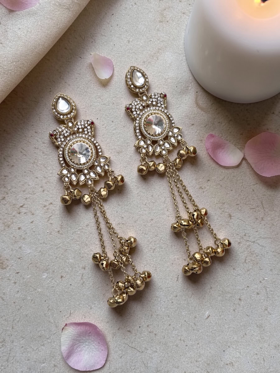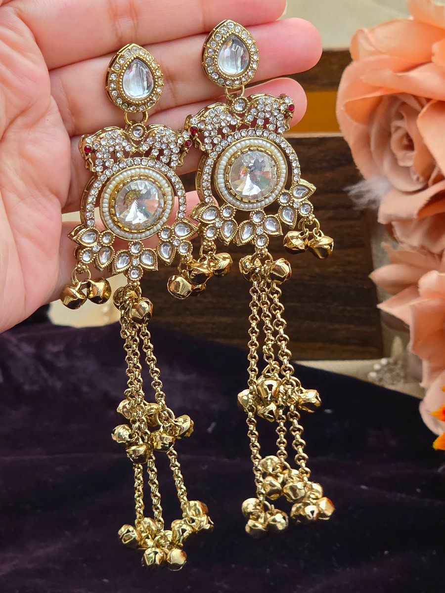Add timeless elegance to your look with StyleLine’s Kashmiri earrings, featuring a white center stone, delicate pearl detailing, and charming ghungroo tassel drops. Perfect for Eid, weddings, festive occasions, and traditional wear in Pakistan.
