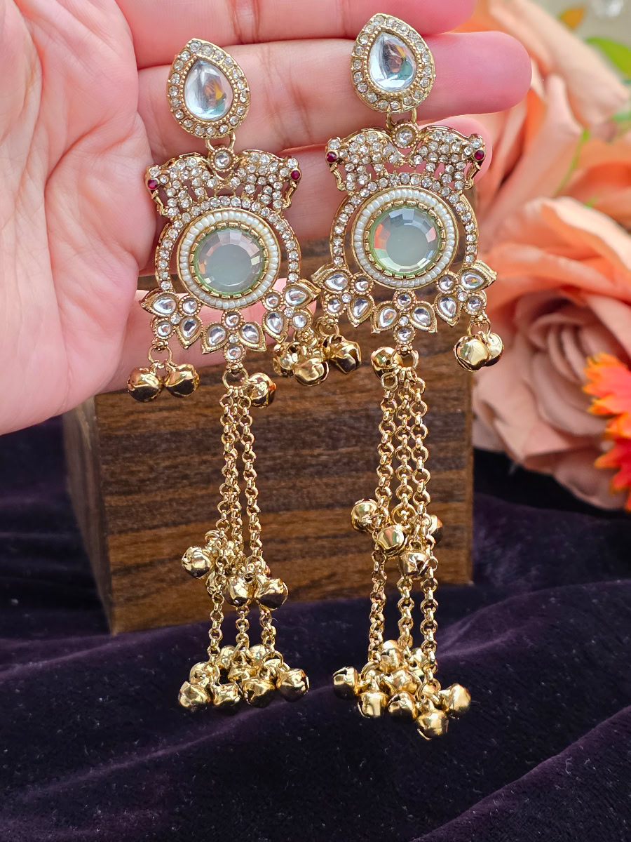 Add timeless elegance to your look with StyleLine’s Kashmiri earrings, featuring a rich sky blue center stone, delicate pearl detailing, and charming ghungroo tassel drops. Perfect for Eid, weddings, festive occasions, and traditional wear in Pakistan.