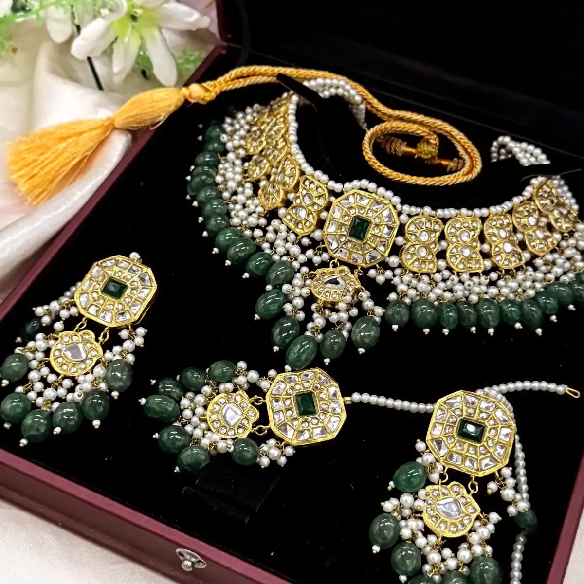 - Embellished with green stones & pearls