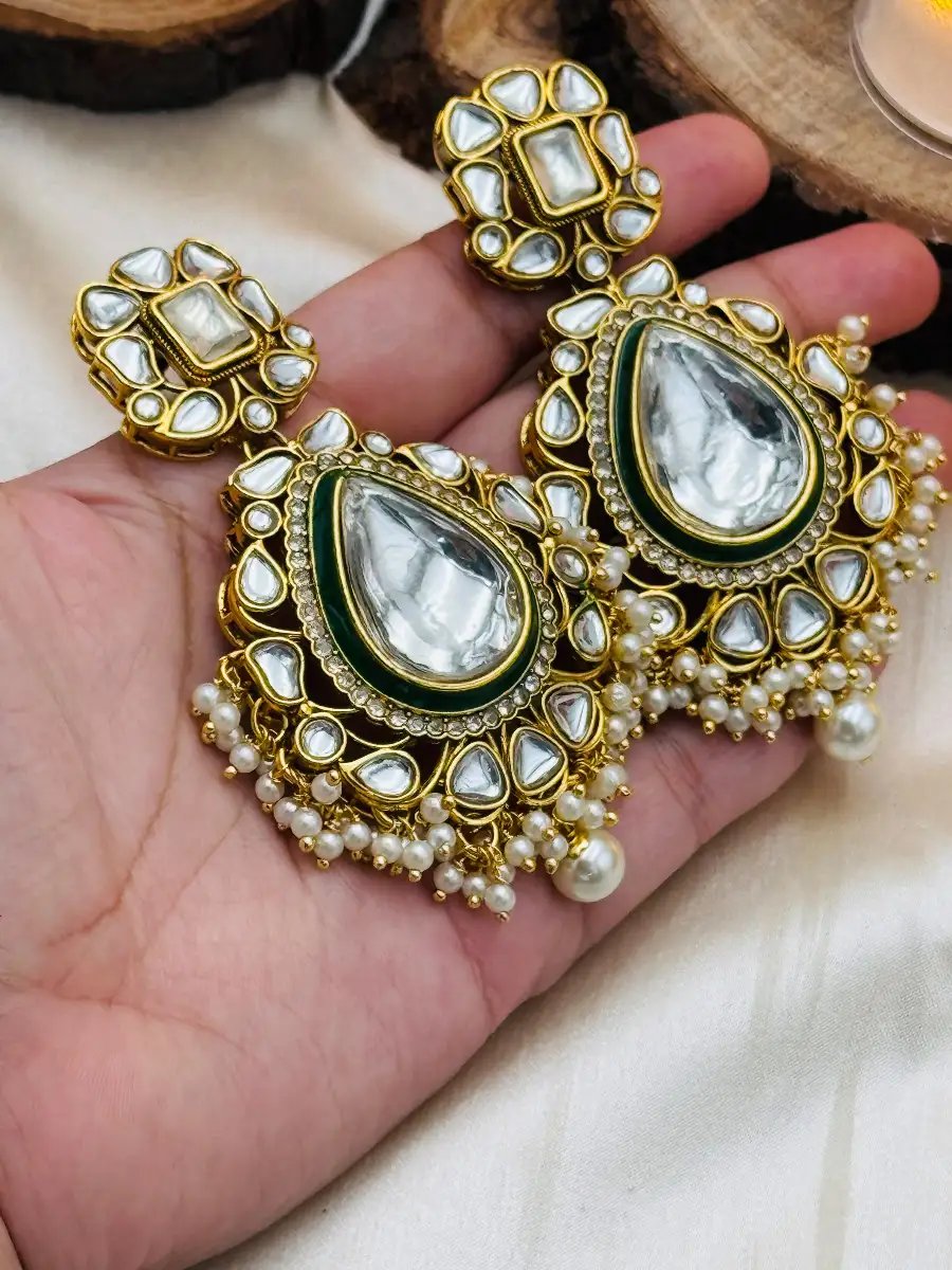 Add a touch of royal elegance to your look with our Premium Uncut Kundan Earrings– a true symbol of timeless craftsmanship. Handcrafted by skilled artisans, these earrings feature uncut Kundan stones set in a classic gold-plated base, highlighted with a green meenakari outline and delicate pearl drops.