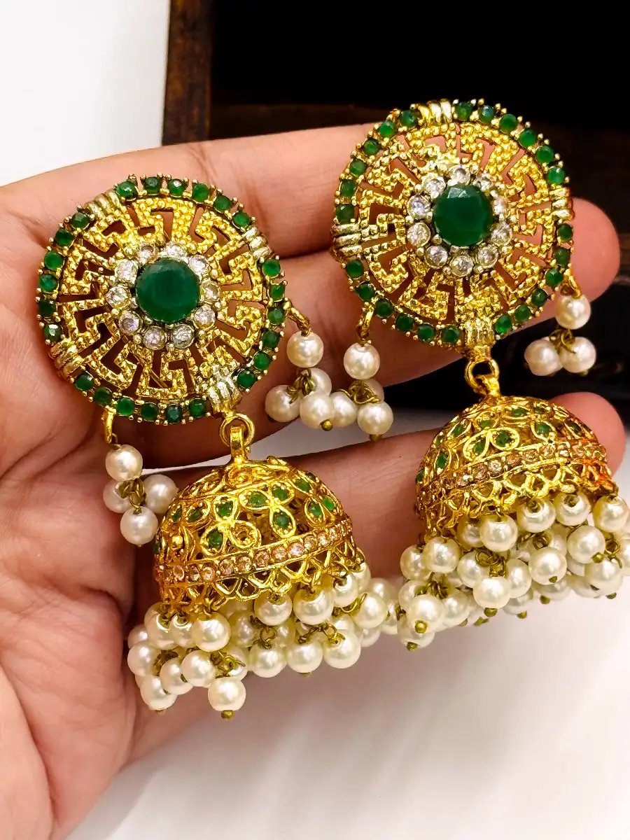 The matching jhumka earrings and tikka complete the set, offering a perfectly coordinated party-wear look. Each element is crafted with high-quality materials, long-lasting polish, and elegant pearl hangings that give the set a rich, royal aesthetic inspired by classic Mughal jewelry.